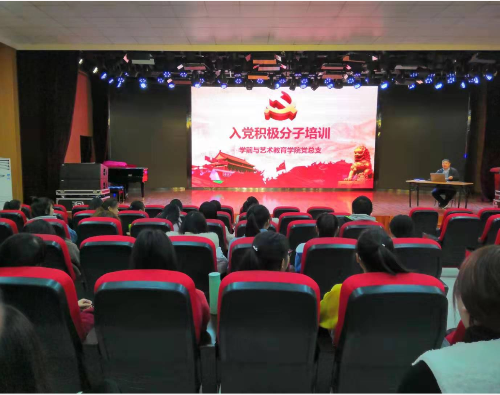 2019年11月18日,学前与艺术教育学院在学院一楼演播厅开展入党积极分子党课培训,本次党课培训由党总支书记王爱东主持,全体入党积极分子参与本次党课培训。