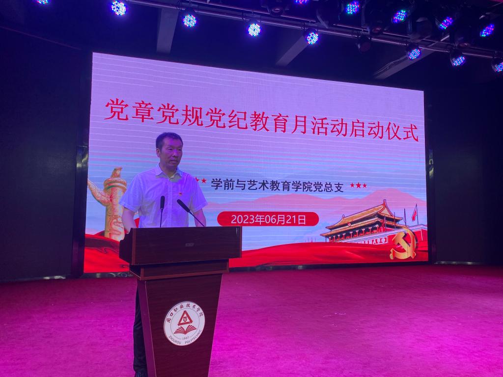 会上,耿润宣读了《周口职业技术学院学前与艺术教育学院2023年党章党规党纪教育月活动方案》,并结合习近平总书记关于《党章》的重要论述,领学了新修订的《中国共产党章程》。