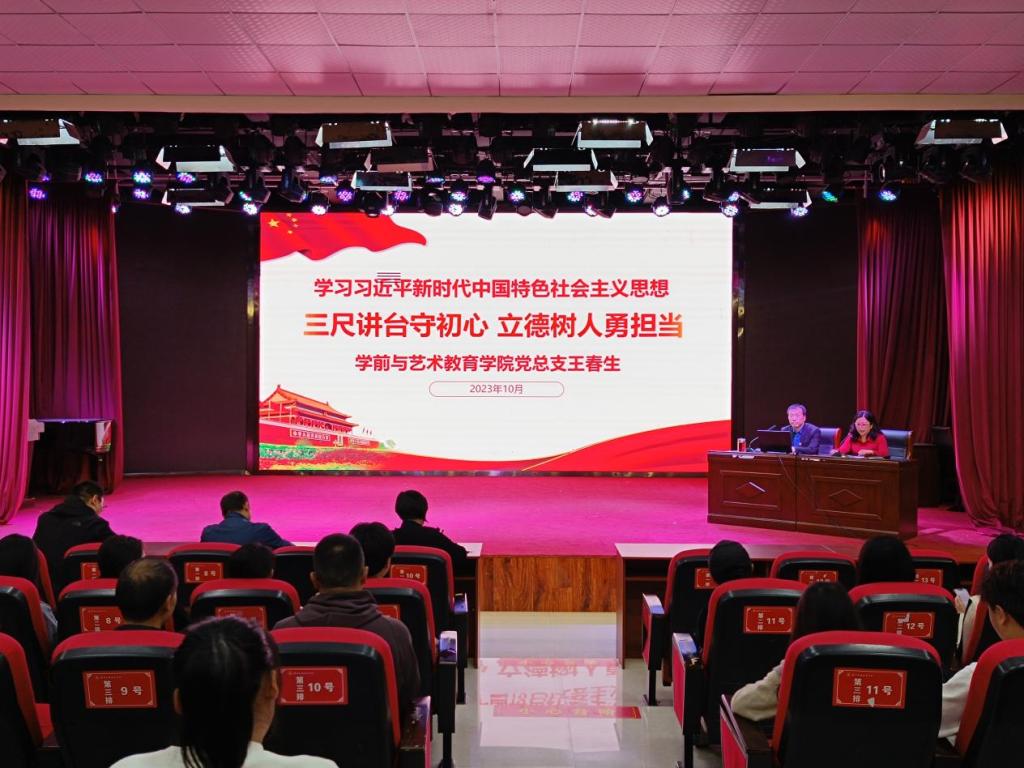为深入开展学习贯彻习近平新时代中国特色社会主义思想主题教育,10月20日下午,学前与艺术教育学院党总支书记王春生讲授题为《三尺讲台守初心,立德树人勇担当》主题教育专题党课,副校长于爱霞以普通党员身份参加学习,学院全体党员教师和学生入党积极分子参加学习。党课由副院长耿润主持。