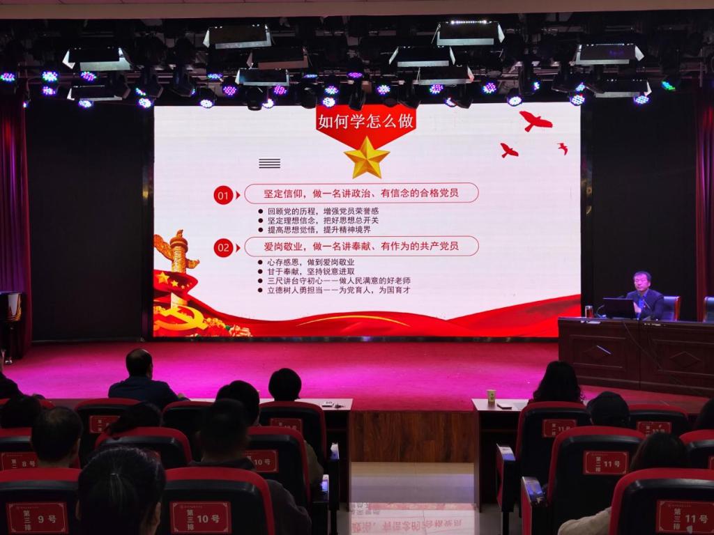 首先,王春生书记结合重大事件、重要人物、伟大精神,深入浅出地向大家阐述了中国共产党如何在百年波澜壮阔的历史进程中由小变大、由弱变强,团结和带领中国人民夺取革命、建设、改革一个又一个伟大胜利,创造人类社会发展史上一个又一个奇迹,带领大家全面回顾了中国共产党披荆斩棘不懈奋斗的光辉历程、深刻领会了百年大党风华正茂的根本原因。随后,他结合我校工作实际和个人理解体会,学习爱岗敬业的典范,鼓励每一位党员教师要牢记党员身份,发挥模范作用,做学习上的“排头兵”,做工作上的“领跑者”,在学校各项学习、工作中亮明党员身份,树立先锋形象,把深入学习与实际工作结合起来,在学思践悟中进一步坚定理想信念、提升党性修养、强化实干本领。