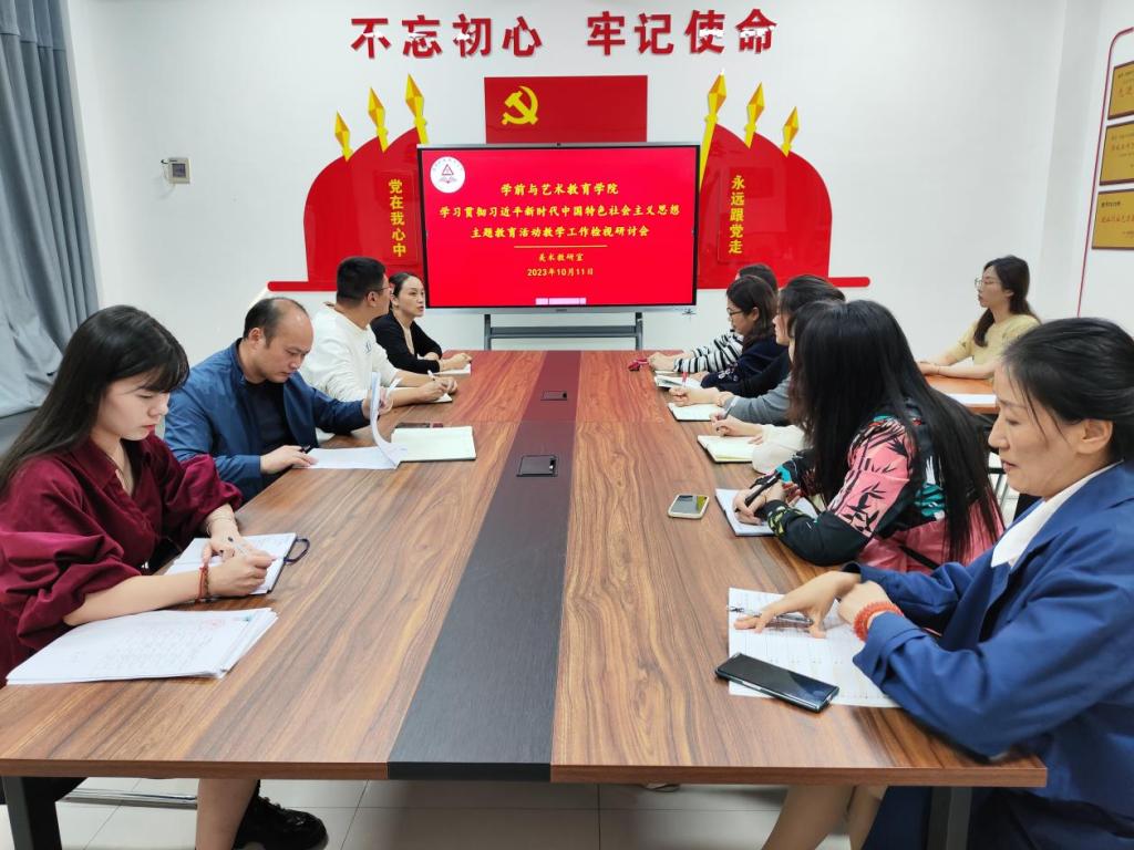 为深入学习贯彻习近平新时代中国特色社会主义思想,加强主题教育学习,10月11号,学前与艺术教育学院在四楼党员活动室举行学习贯彻习近平新时代中国特色社会主义思想主题教育教学工作检视研讨会。院长高岐奎、副院长杨晨、教学办主任李晨阳、教研室主任及各教研室老师参加会议。