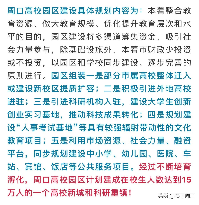 周口高校园区建成后,在校生规模预计达到15万人,将成为一个新的城市发展增长极,集教育、科研、服务、生产、居住、旅游休闲等多种功能为一体的综合型城市社区,成为周口融合发展的新链接、创新发展的新引擎、教育发展的新高地、城市文明的新地标、以文化城的新动能,必将有力提升周口城市发展的首位度和影响力。