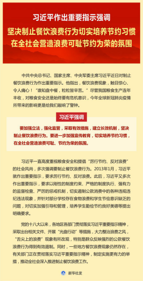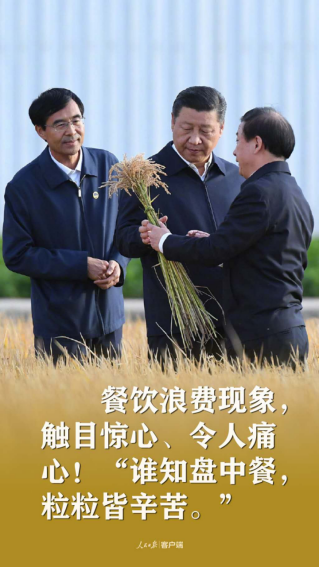 “餐饮浪费现象,触目惊心、令人痛心!‘谁知盘中餐,粒粒皆辛苦’。”习近平总书记近日对制止餐饮浪费行为作出重要指示。他指出,尽管我国粮食生产连年丰收,对粮食安全还是始终要有危机意识,今年全球新冠肺炎疫情所带来的影响更是给我们敲响了警钟。