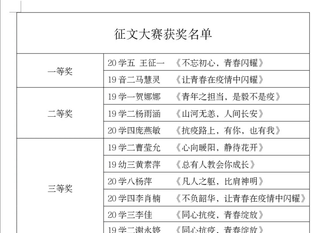 本次征文比赛,聚焦我院青年学生在疫情期间的学习、工作、生活的回顾与总结,通过记录疫情防控期间的难忘时刻,讲述身边抗疫故事,抒发家国情怀,凝聚众志成城、全力以赴、共克时艰的强大正能量,展现出我院青年学生良好的精神面貌。主题征文比赛经过一周的投稿和评选,共收到有效稿件60余篇,经过评选,最终获奖人员共计11人。