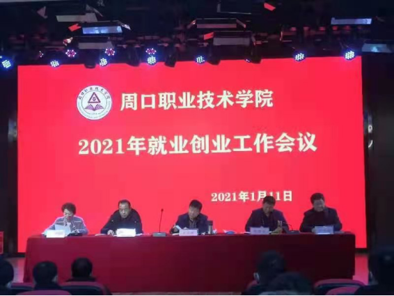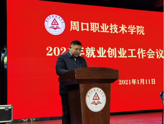 2021年1月11日下午,周口职业技术学院2021年就业创业工作会议在学前与艺术教育学院一楼演播厅召开。党委书记刘士欣,校长李清臣,党委副书记李森,副校长许永安,副校长李秀萍及各二级学院书记、学管副院长、学管办主任、就业指导员、毕业班辅导员参加了会议。