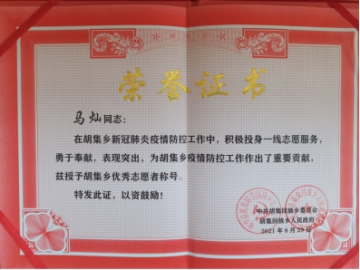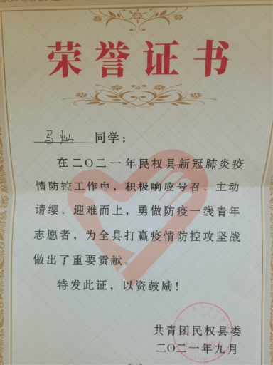 民权县疫情防控指挥部面向社会招募志愿者时,马灿同学没有丝毫犹豫,迅速加入疫情防控阻击战,参与了中高风险人员流调、防控、人员信息核实等防控防疫重要环节工作,并出色完成任务,用自己的实际行动展现了当代青年敢担当、能担当的风采。