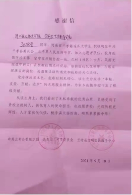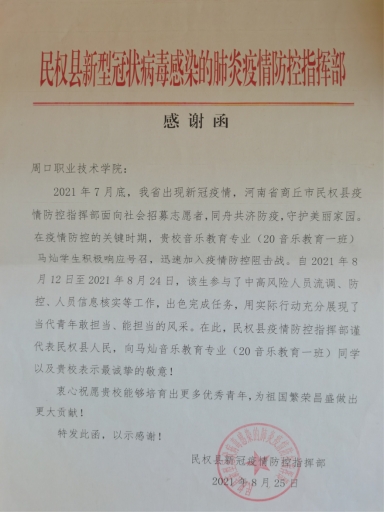 今年夏日,一场疫情防控阻击战,在河南大地打响。经过全国人民历时一个多月的不懈努力后河南疫情终于得到了平息。周口职业技术学院学前与艺术教育学院先后收到了来自中共兰考县组织部、共青团兰考县委员会、兰考县文明实践服务中心和共青团民权县委、民权县新冠疫情防控指挥部、中共胡集回族乡委员会的表扬信。信中表扬我院19级幼儿发展教育一班的张银雪同学和20级音乐教育一班的马灿同学在疫情最严峻的时候积极响应号召,坚守疫情防控岗位,出色的完成疫情防控任务,为此次疫情防控做出了突出重大贡献。