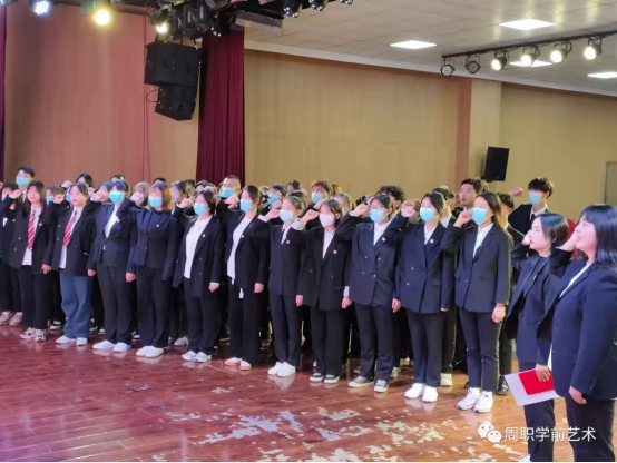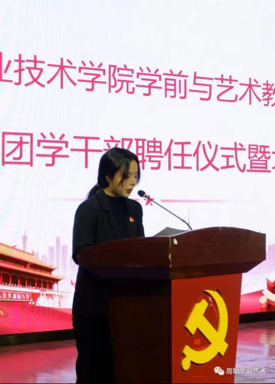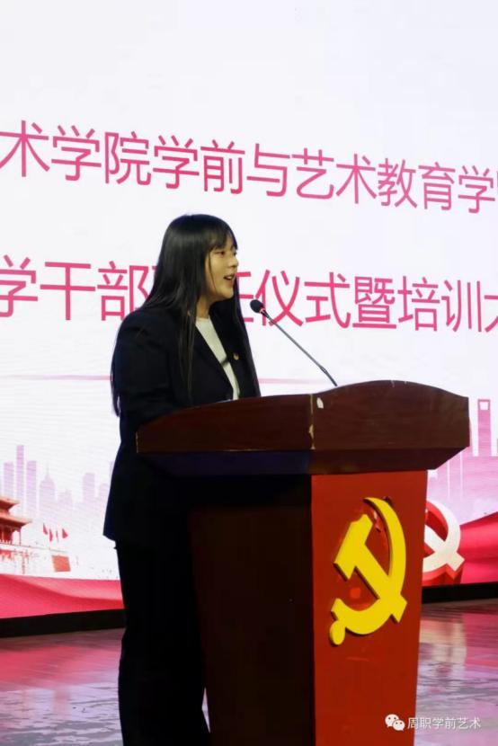 最后由学前与艺术教育学院2021新任学生会主席黄小涵作为领誓人带领新任团学干部宣誓,表明了新一届团学干部为老师同学们服务的坚定决心。