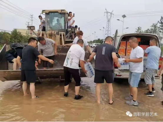 2021年7月20日河南突遭历史罕见的极端强降雨,郑州等多地遭遇特大水灾,当地居民的正常生活与生命财产安全受到严重影响。获悉灾情后,周口职业技术学院学前与艺术教育学院青年学子自发参与官方组织的捐款捐物活动,部分学生积极参加抗洪救援服务队投身到受灾地的救援活动中,他们挥洒青春,用自己的汗水守护家园的平安。