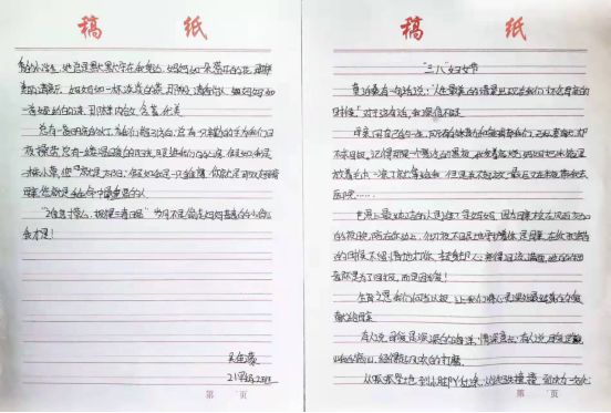 此次征文活动,同学们积极响应,踊跃投稿。他们通过自己的文章来抒发己见。文章内容丰富、词藻优美、情感真挚、健康向上,不但展现了当代大学生积极健康的心理状态,还为女生提供了展示自我的舞台。