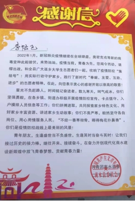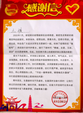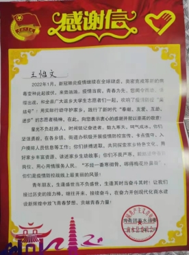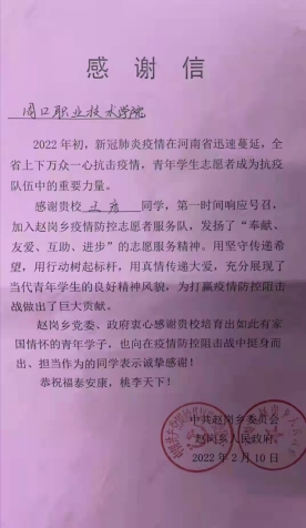 为充分肯定同学们在疫情防控工作中发挥的重要作用,并向无私奉献的疫情防控志愿者们表示感谢。当地有关部门为志愿者颁发了感谢信和荣誉证书,一封封有温度的感谢信和一张张沉甸甸的荣誉证书,是同学们投身疫情防控和践行青春使命最好的证明。