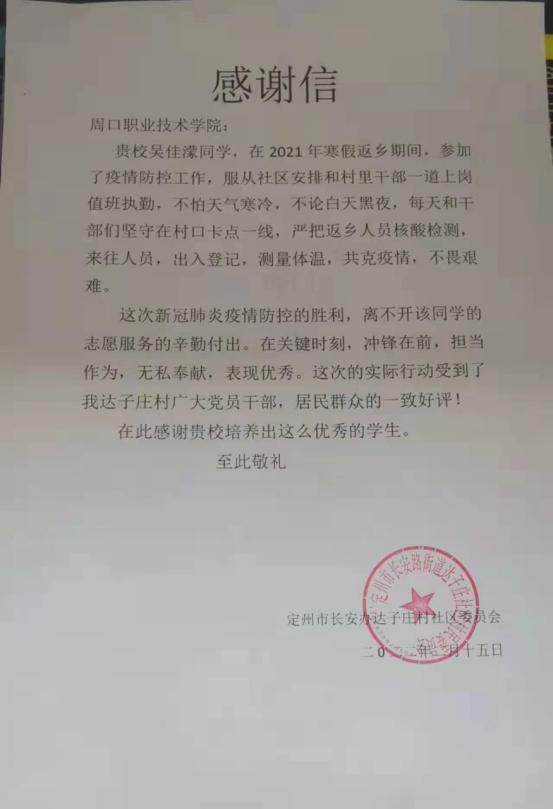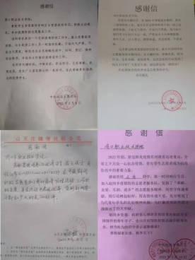 周口职业技术学院学前与艺术教育学院先后收到中共河南省禹州市夏都街道南关社区委员会、中共赵岗乡委员会赵岗乡人民政府、共青团商水县委、定州市长安办达子庄村社区委员会等地的感谢信。