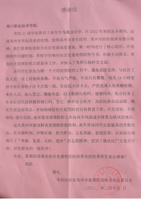 21级学前教育三班马雨言同学,在2022年寒假返乡期间,面对家乡禹州市突如其来的疫情,马雨言同学主动参加了为期一个月的疫情防控工作,为居民群众送温暖,得到了居民群众的一致好评。