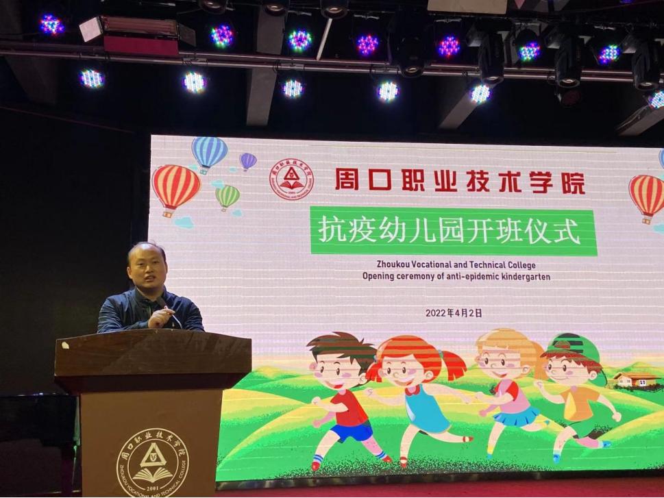 高岐奎做总结发言。他指出,开办“抗疫幼儿园”,不仅让老师们能够更好地投入到工作一线去,而且让小朋友们在疫情下的校园生活同样多姿多彩,同时又给学前教育专业的同学们创造了实践机会。他希望在校领导的支持和帮助下,在全校教职工的关爱下,“抗疫幼儿园”能够真正成为孩子们的乐园。