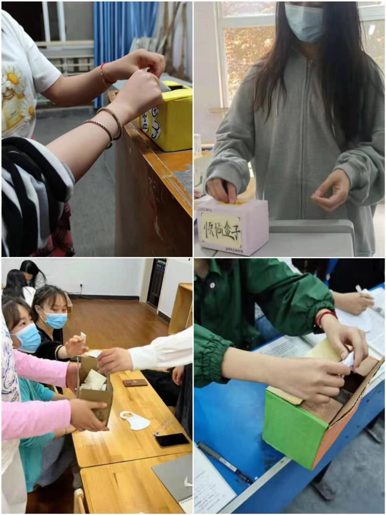 活动以班级为单位进行,每个班级设置一个“烦恼盒子”,同学们将心里的烦恼写下来装进“烦恼盒子”里,让它带走大家的烦恼。