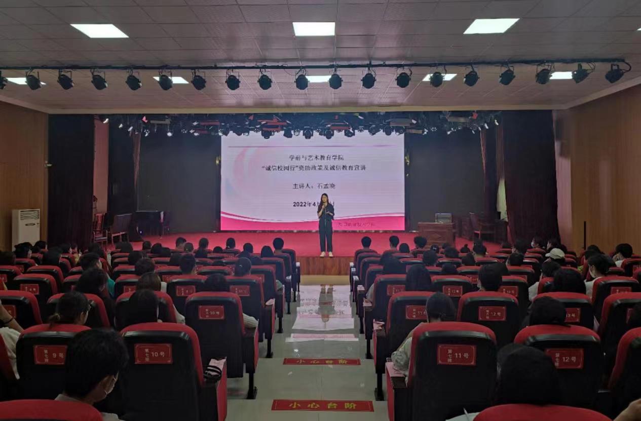 为全面贯彻党的教育方针,深入落实习近平总书记关于教育的重要论述,围绕立德树人根本任务,不断加强精准资助,大力推进资助育人,全面落实各项学生资助政策,学前与艺术教育学院于4月28日晚在一楼演播厅组织开展2022年学生资助政策“两节课”宣讲活动。学院全体学生参加此次活动。
