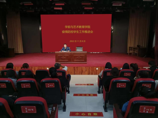 为认真学习党的二十大精神,全面落实疫情防控工作最新要求,11月8日下午1点30分,学前与艺术教育学院在一楼演播厅召开疫情防控学生工作推进会。党总支书记王春生、副院长崔彤彤、学管办主任郑玉凡、21、22级辅导员、自律委员会成员及各班班长参加此次会议。