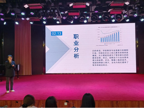 为进一步加强大学生职业发展教育,增强大学生职业生涯规划意识,引导大学生充分认识自我、了解就业环境、明确职业目标,树立正确的成才观、择业观和就业观。学前与艺术教育学院于10月29日下午在学院一楼演播厅举办以“逐梦青春•职赢未来”为主题的第三届大学生职业生涯规划大赛初赛。经过前期海选选拔,共有16名选手参加本场比赛。副院长崔彤彤,团总支书记刘馨馨、辅导员老师石孟晓、刘楠、蔚春抒出席比赛,并担任评委。