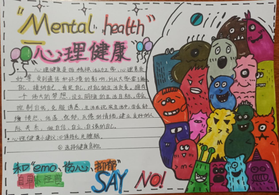 同学们同样也进行了手抄报的创作,把心理健康知识融入到日常中,营造浓厚的学习心理健康知识的氛围。