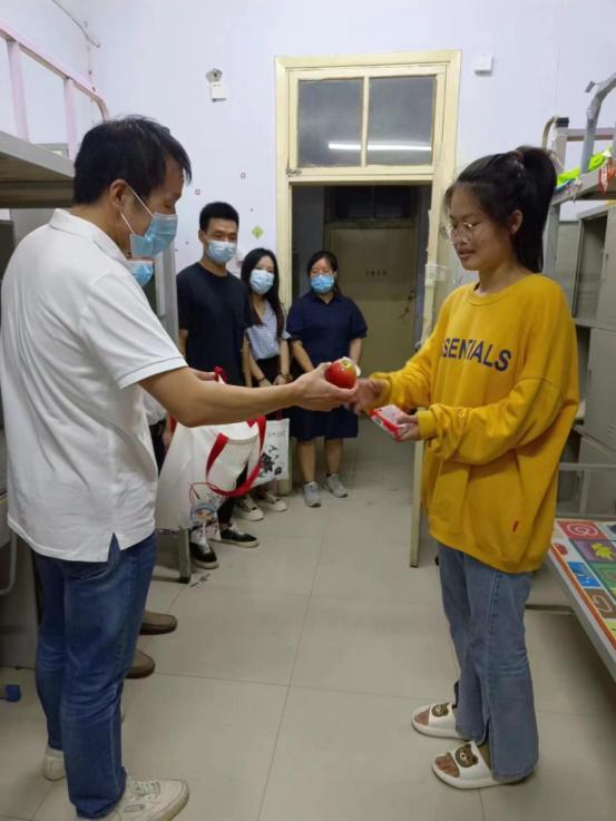 学前与艺术教育学院领导班子及新生辅导员来到校外酒店看望返校新生并进行了亲切慰问,让同学感受到了来自学院的温暖,学生父母对此表示感谢。随后,来到宿舍对提前到校新生进行慰问并送上学院精心定制的中秋大礼包,里面有象征着团圆的中秋月饼和希望同学们平安到校的爱心苹果,希望能让新同学感受到学院浓浓的爱与关怀。