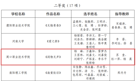 41.9月27日,由我院王春生、高岐奎、杨晨、田钰等老师指导的作品《润物无声》《奋进》《鸡毛人逗蟾》分别荣获河南省第十八届大学生科技文化艺术节二等奖。