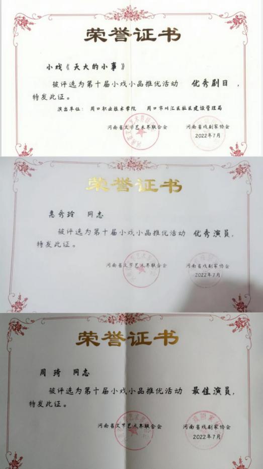 30.7月18日,我院戏曲专业老师编排的戏曲节目《天大的小事》荣获第十届河南省小戏小品推优大赛优秀剧目,惠秀玲老师、周琦老师分别荣获第十届河南省小戏小品推优活动优秀演员、最佳演员。