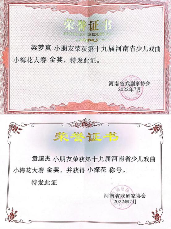 31.7月21日,我院学生梁梦真、袁超杰分别荣获第十九届河南省少儿戏曲小梅花大赛金奖。