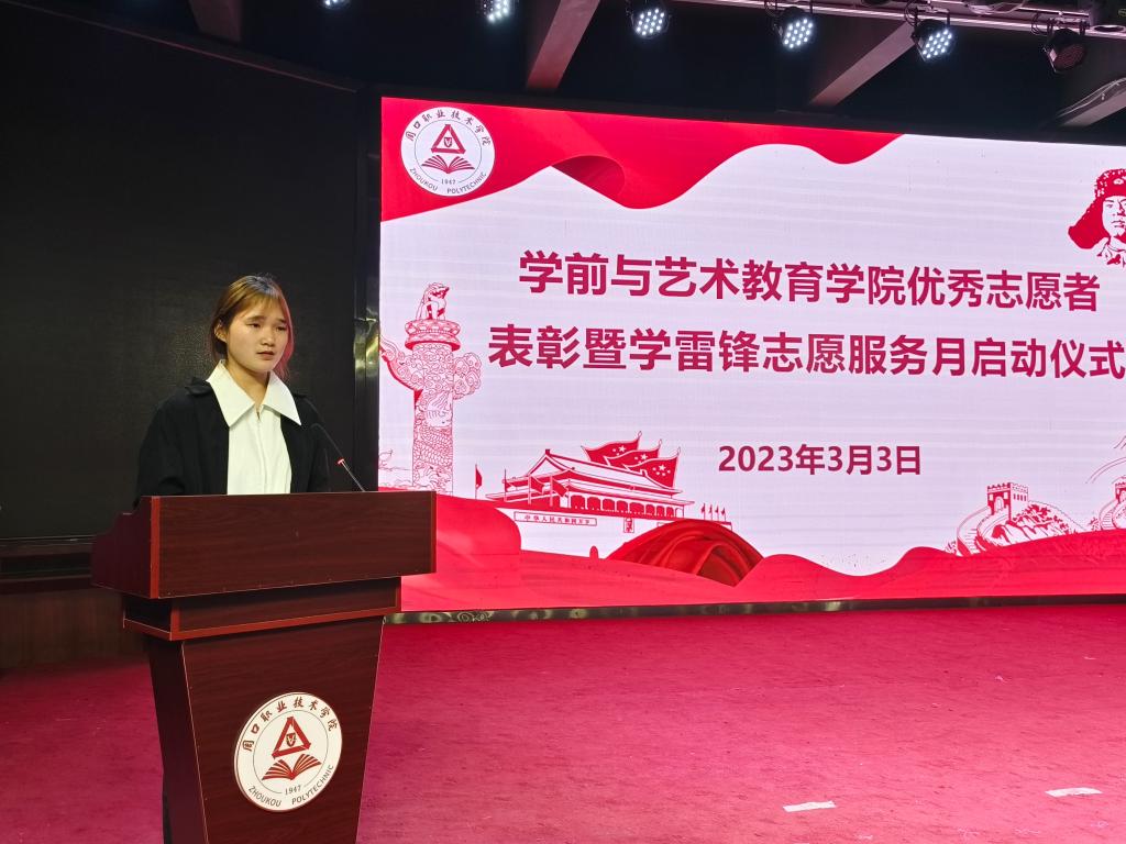 22级学前教育三班学生焦瑶作为优秀志愿者代表上台发言,她表示沉甸甸的证书,是一种责任和使命,她号召同学们向雷锋同志学习,将雷锋精神融入日常学习和生活中去,为建设更美好的周口职业技术学院继续贡献自己的爱心和力量。