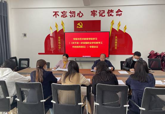 为深入学习贯彻党的二十大精神,全面落实全国、全省职业教育大会精神,进一步加强我院教育教学工作,全体提升各专业人才培养质量,2023年3月6日下午,学前与艺术教育学院全体教学管理工作成员在四楼党员活动室召开专题会议,集中学习河南省教育厅《关于进一步加强职业学校教学工作的指导意见》。本次会议由耿润院长主持,高岐奎院长、杨晨主任及全体教研室主任参会。