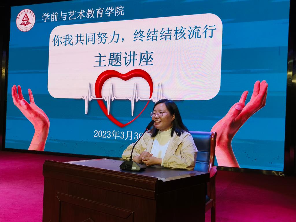 为深入贯彻党的二十大精神,践行“人民至上,生命至上”的理念,呼吁广大师生重视结核病的防控,切实做好校园传染病预防工作,营造健康和谐的校园环境,3月30日,学前与艺术教育学院在一楼演播厅开展预防结核病主题讲座宣传教育系列活动。讲座由学管办主任郑玉凡主讲,21、22级学生代表到场聆听。