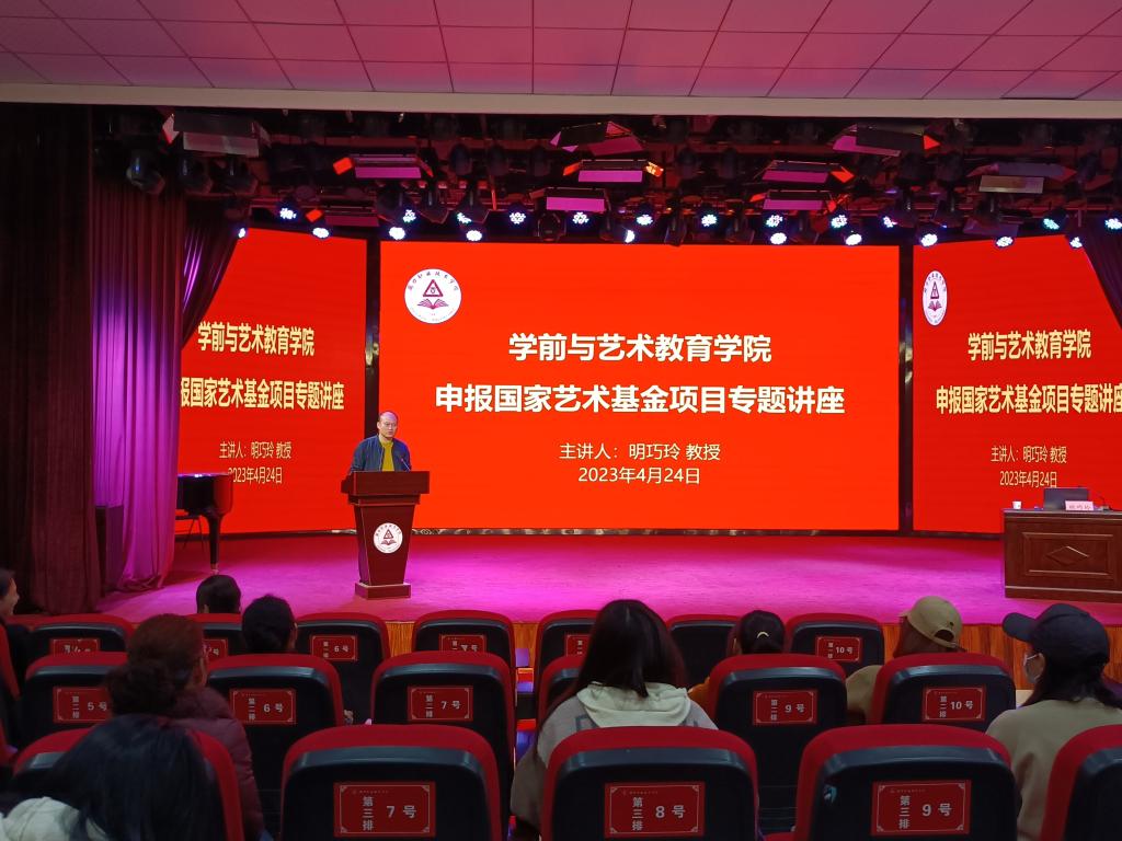 为有效推进我校国家艺术基金申报工作,2023年4月24日下午,学校邀请河南省文化艺术研究院研究馆员、国家艺术基金河南办公室明巧玲主任,在学前与艺术学院演播厅举办国家艺术基金2024年度资助项目申报工作辅导讲座,副校长王隼、科研外事处处长李民、学前与艺术教育学院党总支书记王春生出席讲座,相关院部教师参加聆听,讲座由学前与艺术教育学院院长高岐奎主持。