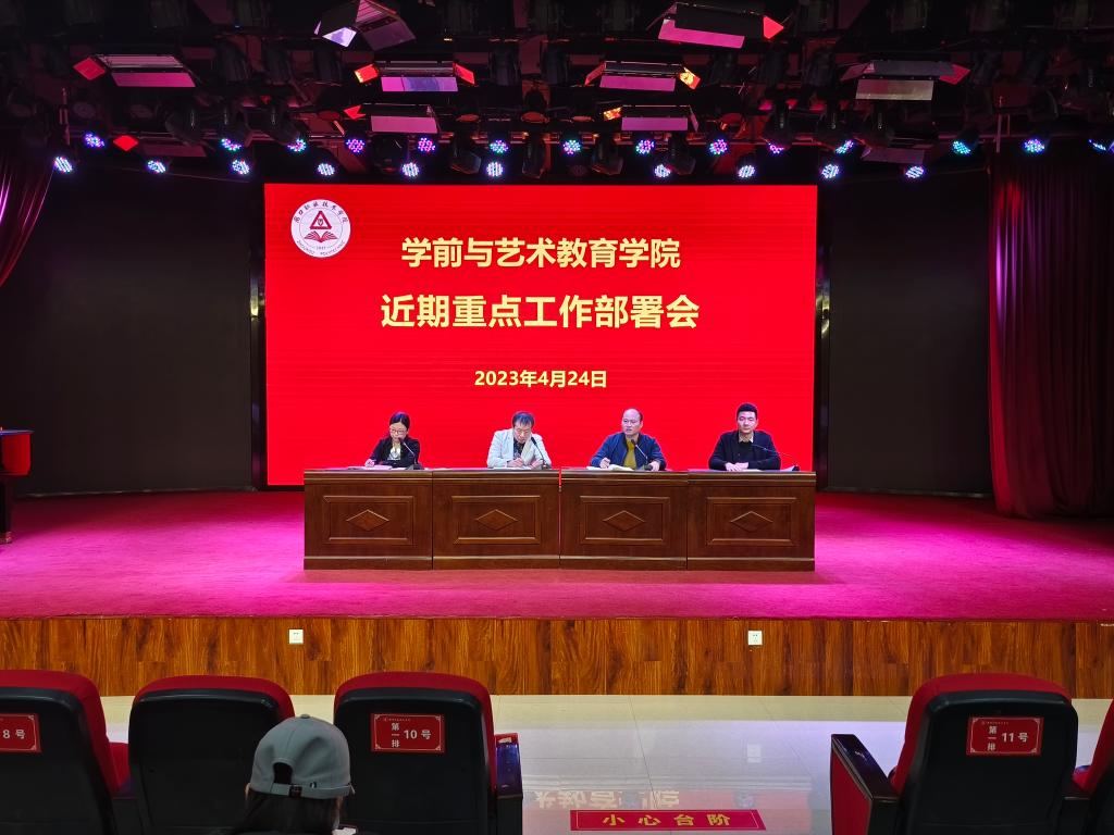 2023年4月24日,学前与艺术教育学院在一楼演播厅召开近期重点工作部署会,党总支书记王春生、院长高岐奎带领学院领导班子成员出席会议,学院全体老师参加会议。