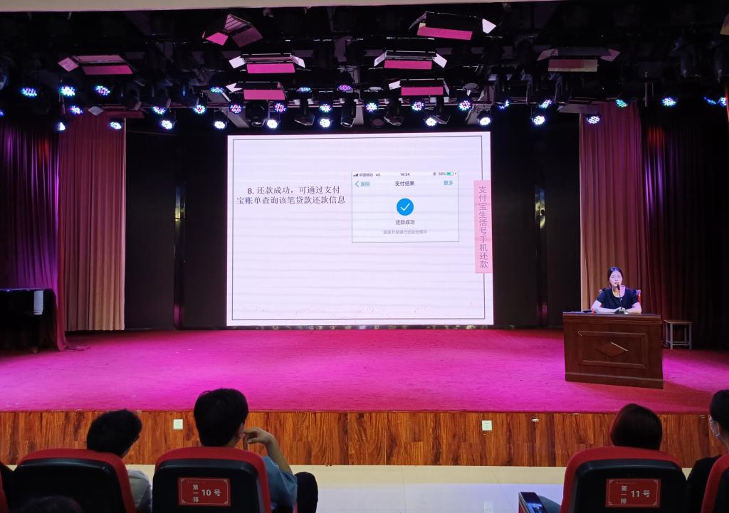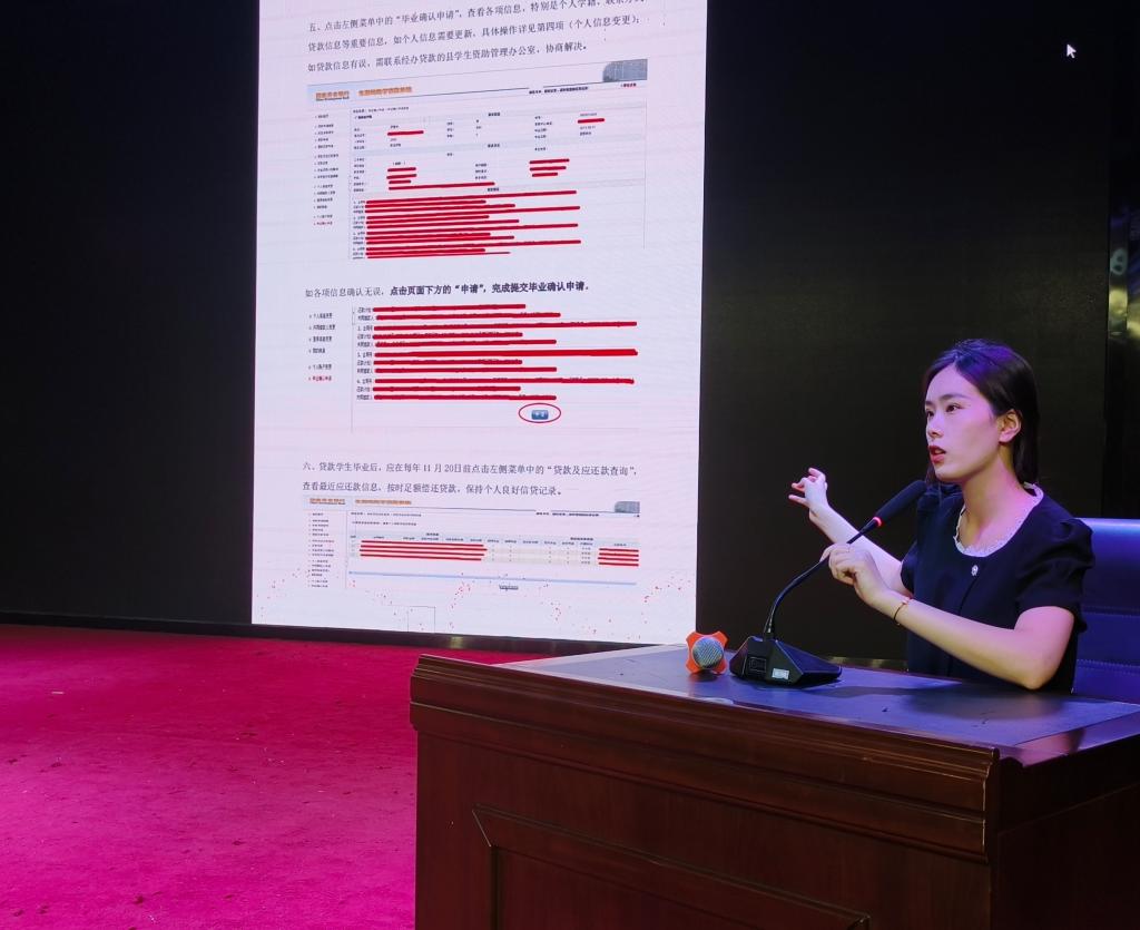 宣讲会上,资助专员石孟晓围绕高校学生助学贷款政策体系,对生源地助学贷款、校园地助学贷款等资助政策进行介绍说明,对其申请条件、发放指南、毕业确认、还款流程四个方面作了详细讲解。随后,石孟晓老师认真为同学们答疑解惑,结合大学生未及时清偿助学贷款的具体案例,强调维护个人信用的重要性,引导学生提高征信意识,主动履行贷款承诺,按时还付贷款本息。
