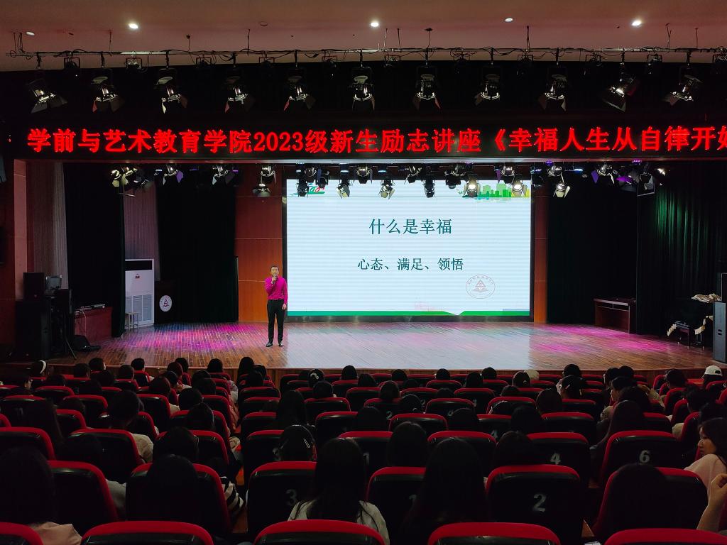 为引领学生树立正确的人生观、价值观,建设良好的校风和学风,激励更多的同学在学习和生活中增强斗志、磨砺意志,10月9日晚上7点,学前与艺术教育学院在学校砺德厅举办“幸福人生从自律开始”2023级新生励志主题讲座。学管办主任郑玉凡、2023级辅导员及全体新生聆听了此次讲座,讲座由学院党总支书记王春生主讲。