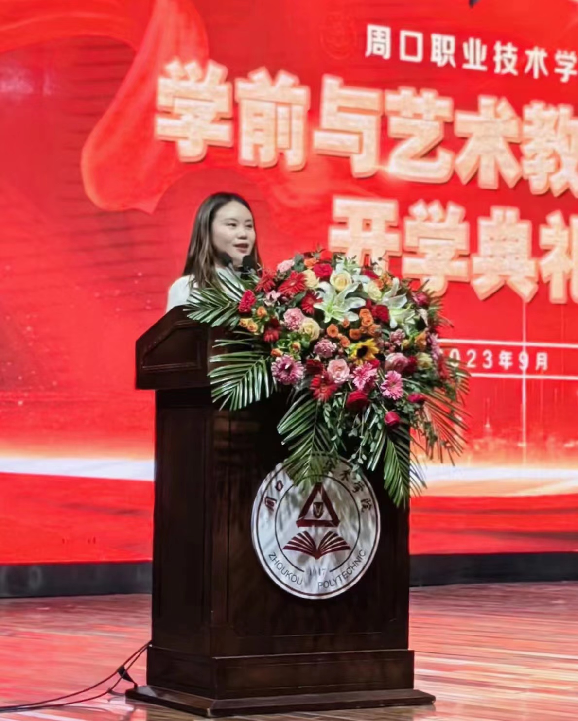 辅导员代表李乐萌老师发言:辅导员是一份良心工作,对于2023级的新生给出建议与大家共勉!一是希望大家做一个有担当,遇事不逃避,敢于面对的人;二是做一个有爱、且内心坚定的人;三是不要嫉妒别人,做一个包容、豁达的人。在学前与艺术教育学院领导班子的带领下,在各位辅导员的热心关怀下,去经历、去丰富、去施展,在不断的经历中更好地认识自己,希望你们有担当、有理想、自信丰盈、剑指远方!