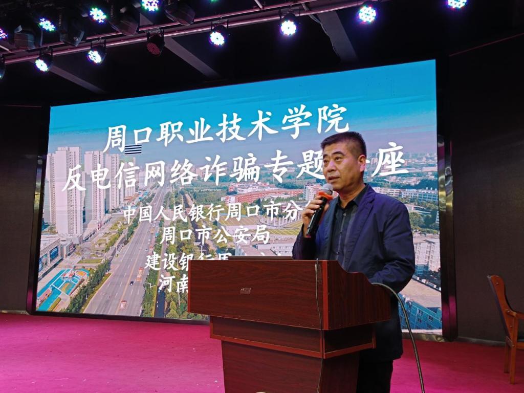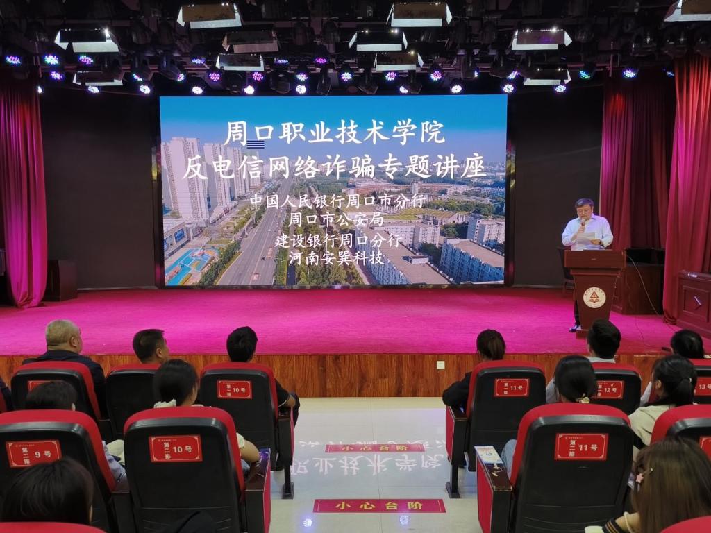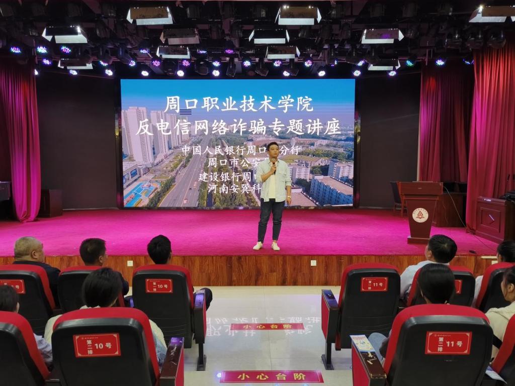 为深入学习贯彻习近平新时代中国特色社会主义思想,全面落实党的二十大精神,进一步提高广大师生的反诈意识,全力打造平安和谐校园,中国人民银行周口市分行、周口市公安局、周口职业技术学院、中国建设银行周口分行联合举办本次反电信网络诈骗专题讲座。中国人民银行周口市分行支付结算科杜社清科长、周口市公安局反作中心朱心岭、中国人民银行周口市分行支付结算科杜社清副科长、周口职业技术学院治安保卫处康楠副处长、中国建设银行周口分行个人金融部总经理刘红兵、中国建设银行迎宾大道支行行长轩基伟出席讲座。