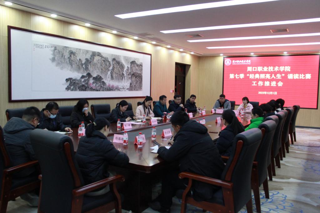 为更好的传承和弘扬中华优秀经典文化,提升文化育人品牌水平,12月1日下午,周口职业技术学院在校第六会议室召开第七季“经典照亮人生”诵读比赛工作推进会。大赛组委会人员、各院部负责领导、辅导老师参加推进会。会议由学生处副处长王换换主持。
