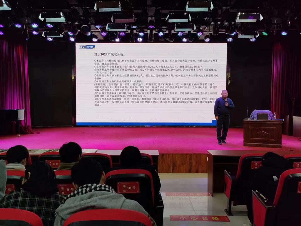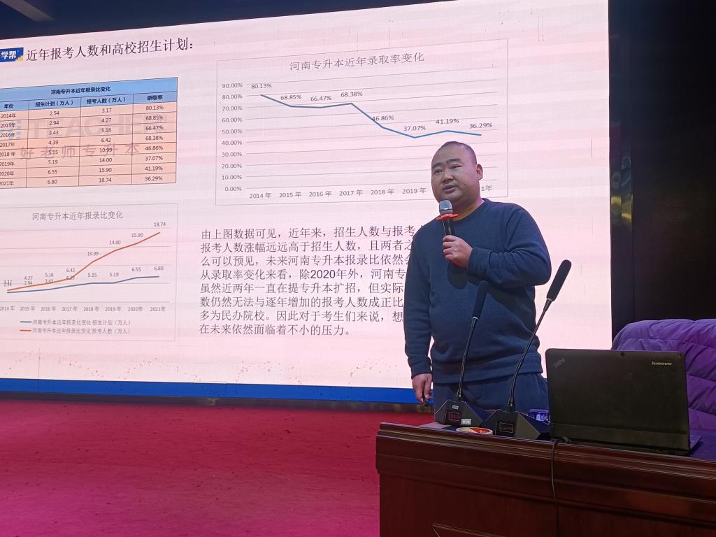 主讲人从学历提升的重要性、专升本的优势、特点、报考条件、报考建议等多个方面来进行说明,围绕近几年专升本政策的变化及未来的发展趋势进行讲解,他通过对专升本历年数据对比,综合分析了专升本考试内容、招考院校、招生计划等情况,与现场的同学进行互动交流,对学生专业的学习和升本的院校提出了建议。
