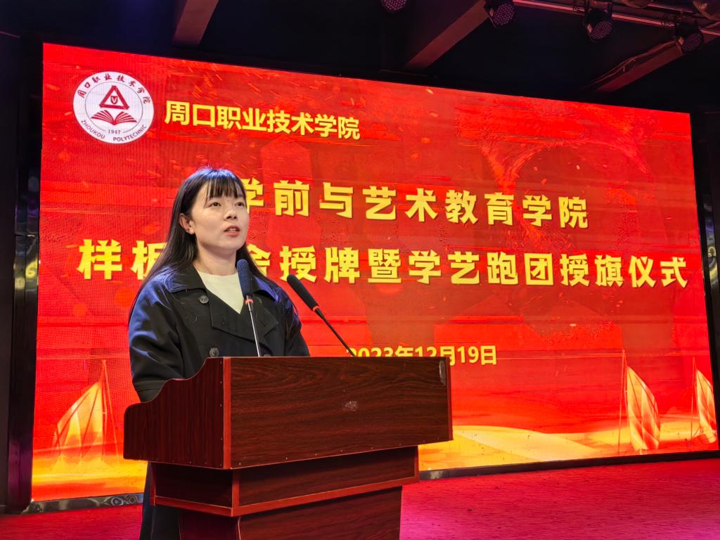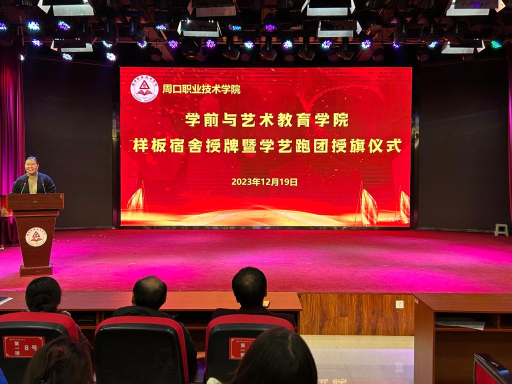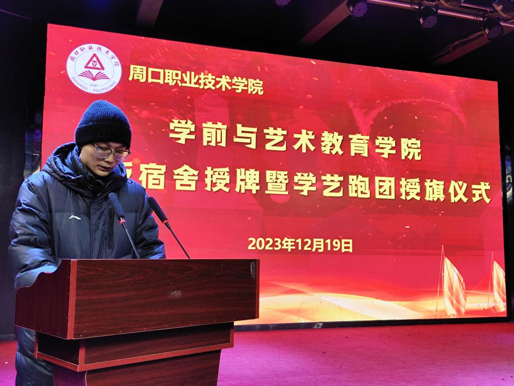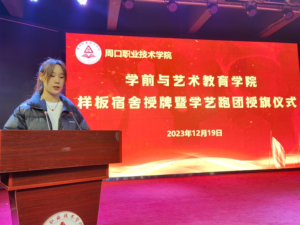 仪式上,教学办主任李晨阳宣读《周口职业技术学院学前与艺术教育学院关于样板宿舍的决定》及《周口职业技术学院学前与艺术教育学院关于对学艺跑团第二届团员授旗的决定》。