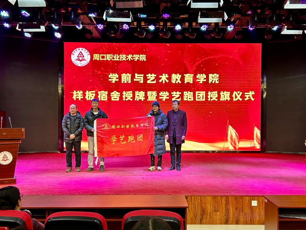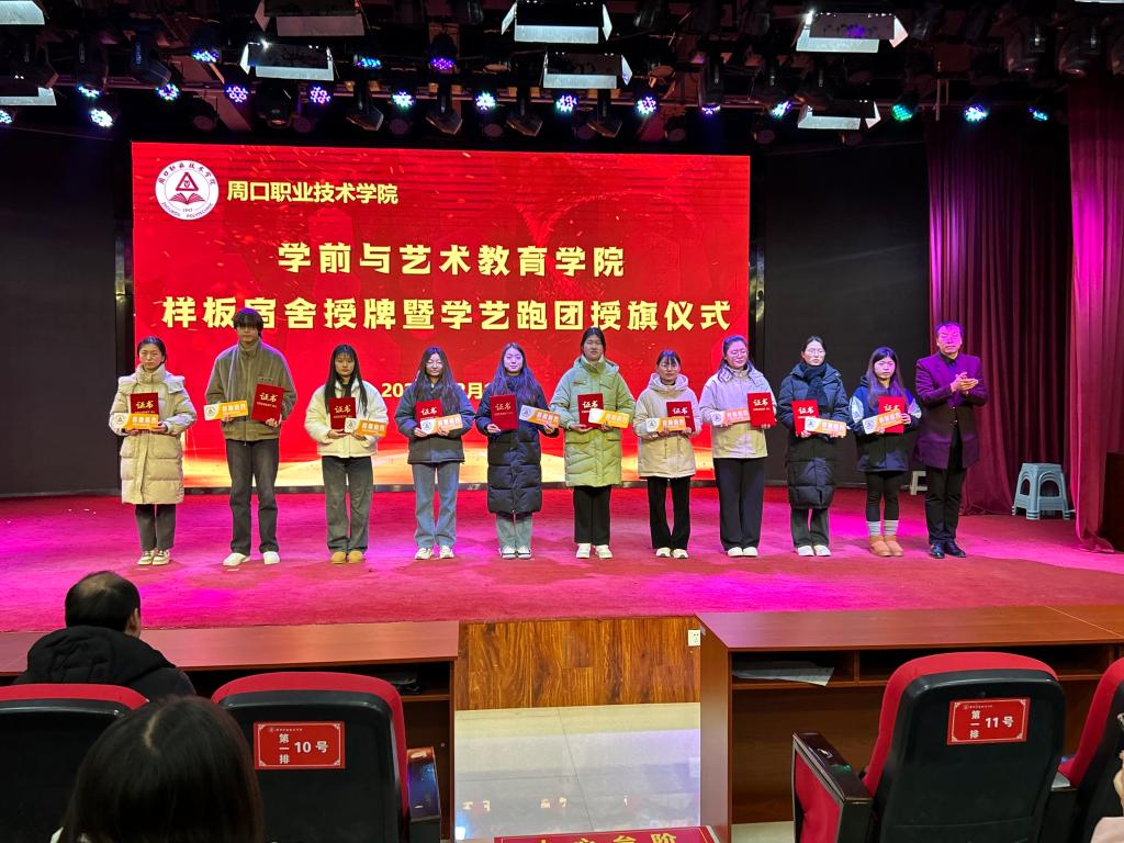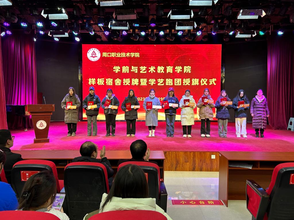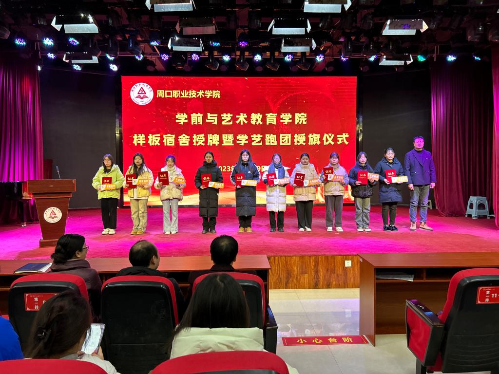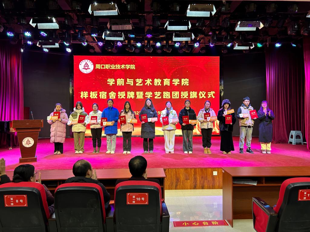 仪式上,教学办主任李晨阳宣读《周口职业技术学院学前与艺术教育学院关于样板宿舍的决定》及《周口职业技术学院学前与艺术教育学院关于对学艺跑团第二届团员授旗的决定》。