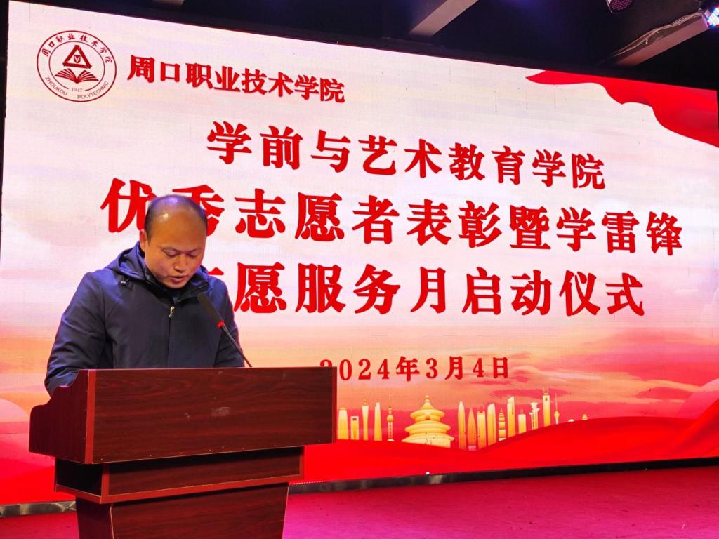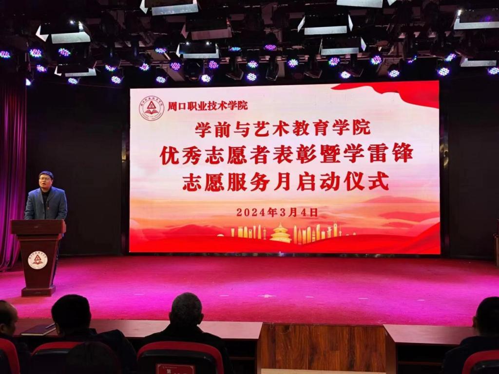 在第61个学雷锋纪念日到来之际,为学习雷锋精神,展文明实践风采,3月4日下午,学前与艺术教育学院在艺术演播厅举行优秀志愿者表彰暨学雷锋志愿服务月启动仪式,周口职业技术学院副校长王隼、校党委宣传部部长万四新、学生处处长刘冬霞、团委书记闻檑出席仪式,学前与艺术教育学院领导班子、22、23级辅导员、团学骨干、入党积极分子及志愿者代表参加仪式。仪式由学院副院长杨晨主持。