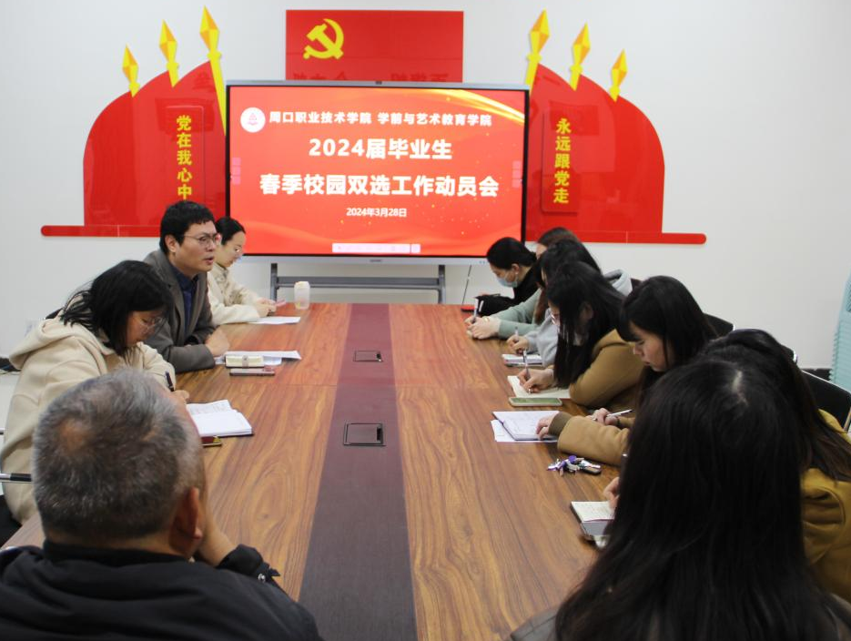 为进一步拓展2024届毕业生的就业渠道,促进毕业生顺利实现就业,3月28日上午,学前与艺术教育学院在四楼会议室召开2024届毕业生春季校园双选工作动员会。学前与艺术教育学院副院长杨晨、学管办主任郑玉凡、教管办主任李晨阳出席动员会,毕业班辅导员参加动员会。