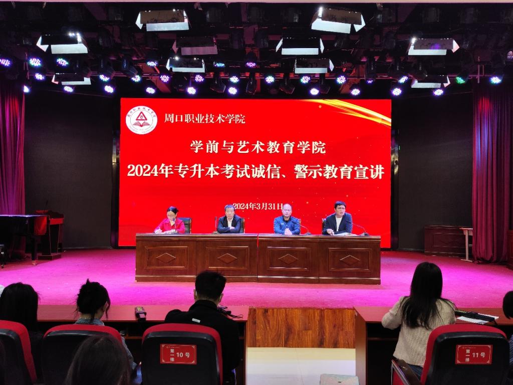 为落实学校2024年专升本考试工作要求,加强考生诚信教育,严肃考风考纪,教育引导考生践行诚信准则,营造风清气正的考试氛围,3月31日,学前与艺术教育学院在艺术演播厅召开2024年专升本考试诚信、警示教育宣讲会。学前与艺术教育学院党总支书记王春生、院长高岐奎、副院长耿润、副院长杨晨出席宣讲会,教管办主任李晨阳、学管办主任郑玉凡、2024届毕业班辅导员及专升本考生参加宣讲会,宣讲会由副院长耿润主持。