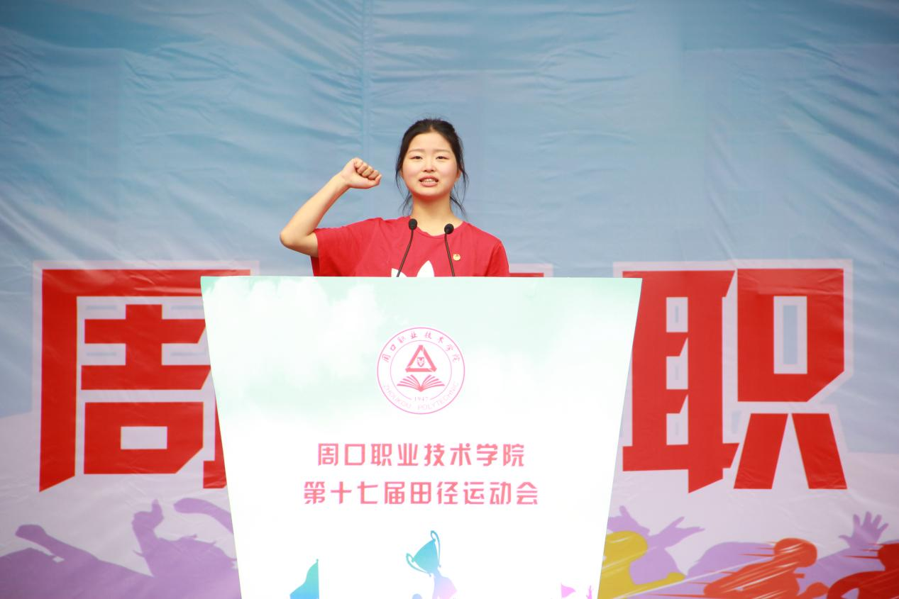 运动员代表学前与艺术教育学院2023级学前教育五班彭张敏进行宣誓:我们将以饱满的热情参加本届运动会,严格遵守赛事的各项安排,遵守比赛规则和赛场纪律,服从裁判,尊重对手,团结协作,公平竞争,顽强拼搏,赛出风格,赛出水平!