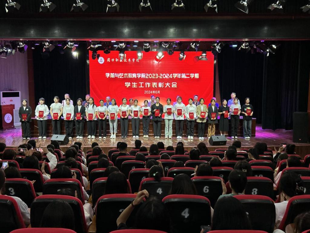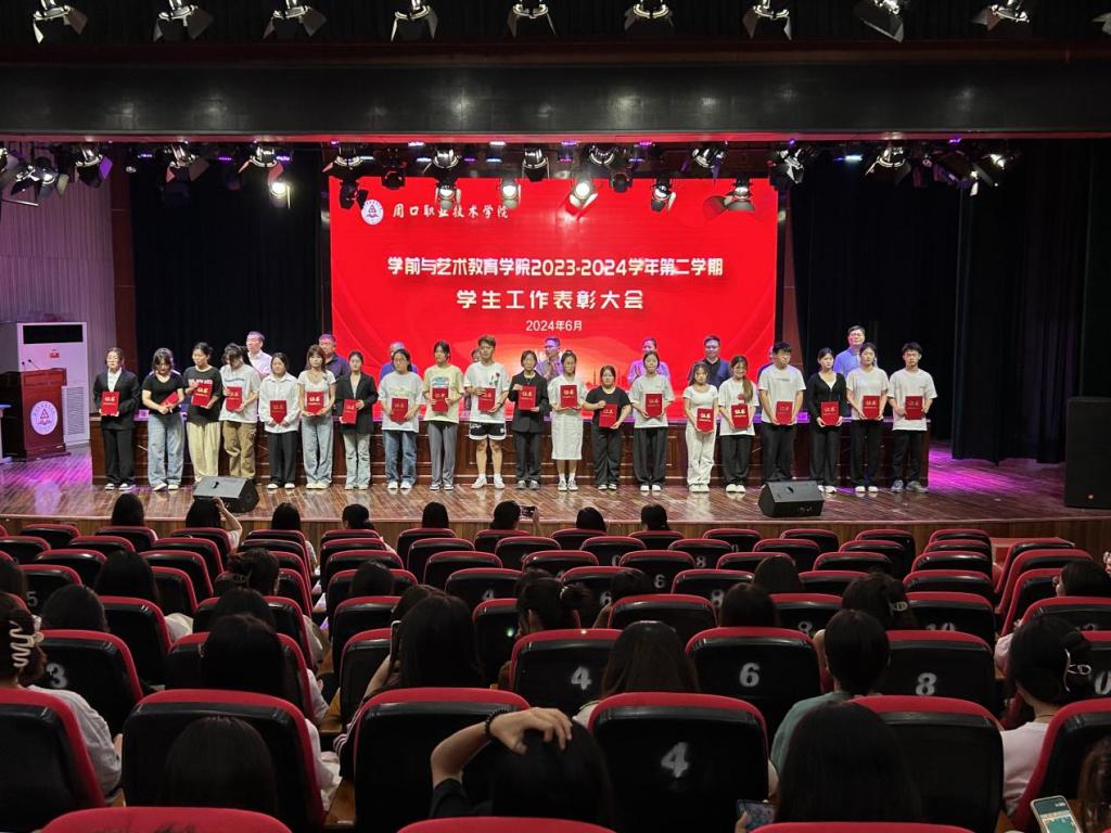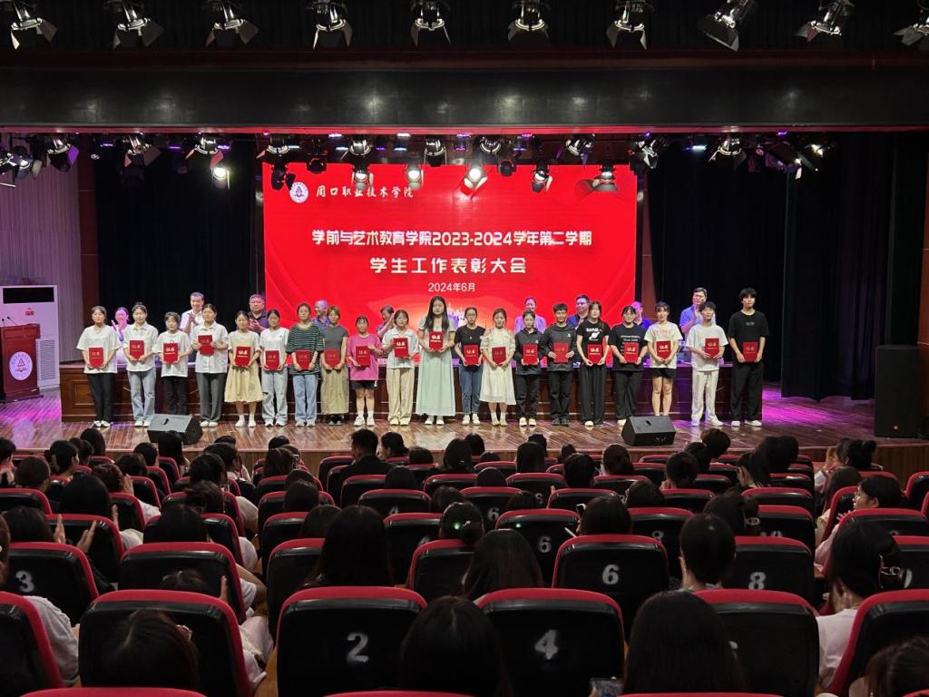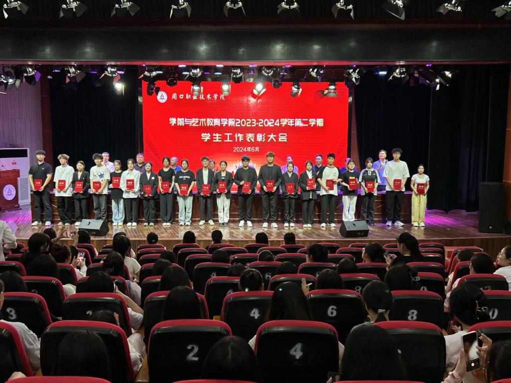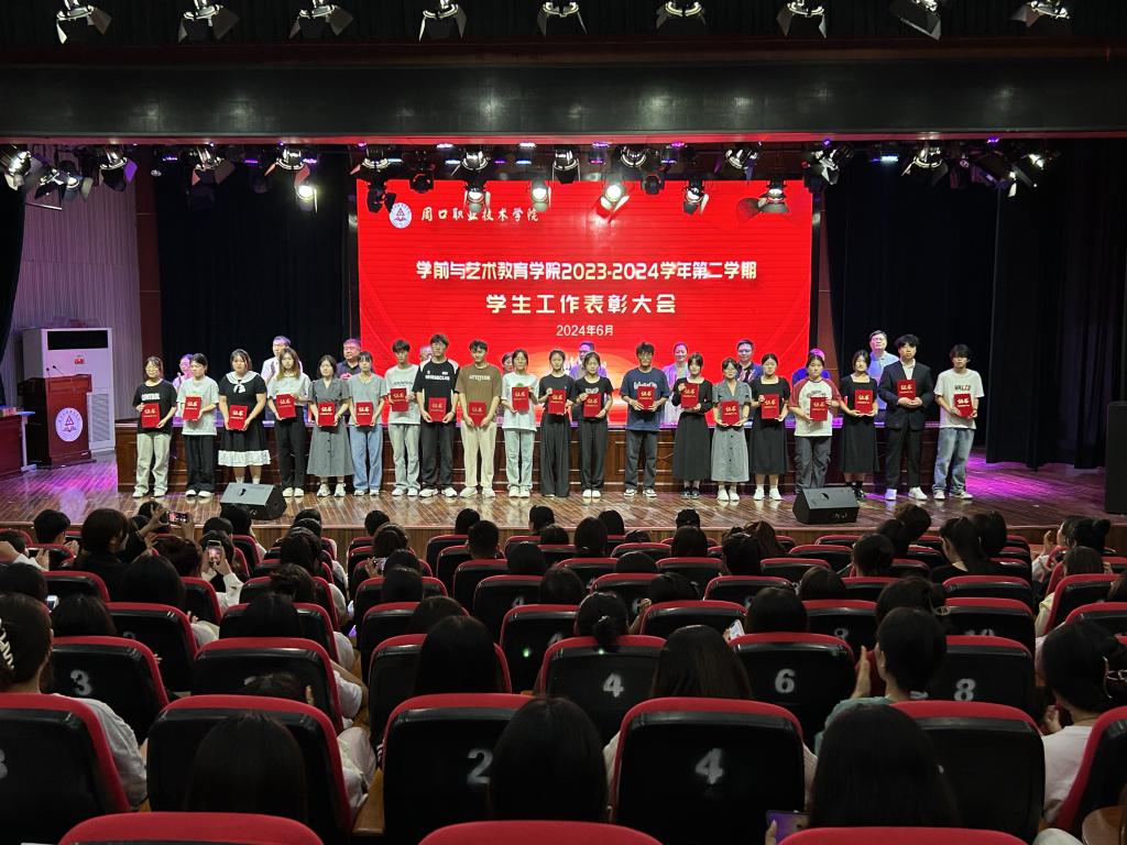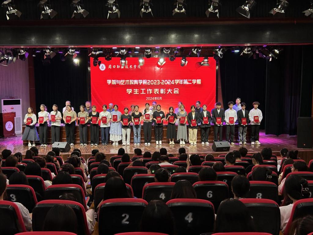为表彰优秀,鼓舞斗志,凝聚优秀榜样力量,激励学生见贤思齐、奋发进取,营造校园浓厚学习氛围,6月12日晚,学前与艺术教育学院在校砺德厅举办2023—2024学年第二学期学生工作表彰大会。周口职业技术学院副校长李秀萍、副校长王隼、校党委宣传部部长万四新、学生处处长刘冬霞、后勤处处长王爱东、校团委书记闻檑出席,学院领导班子、教研室主任、辅导员、获奖学生及22、23级学生代表参加大会。大会由副院长杨晨主持。