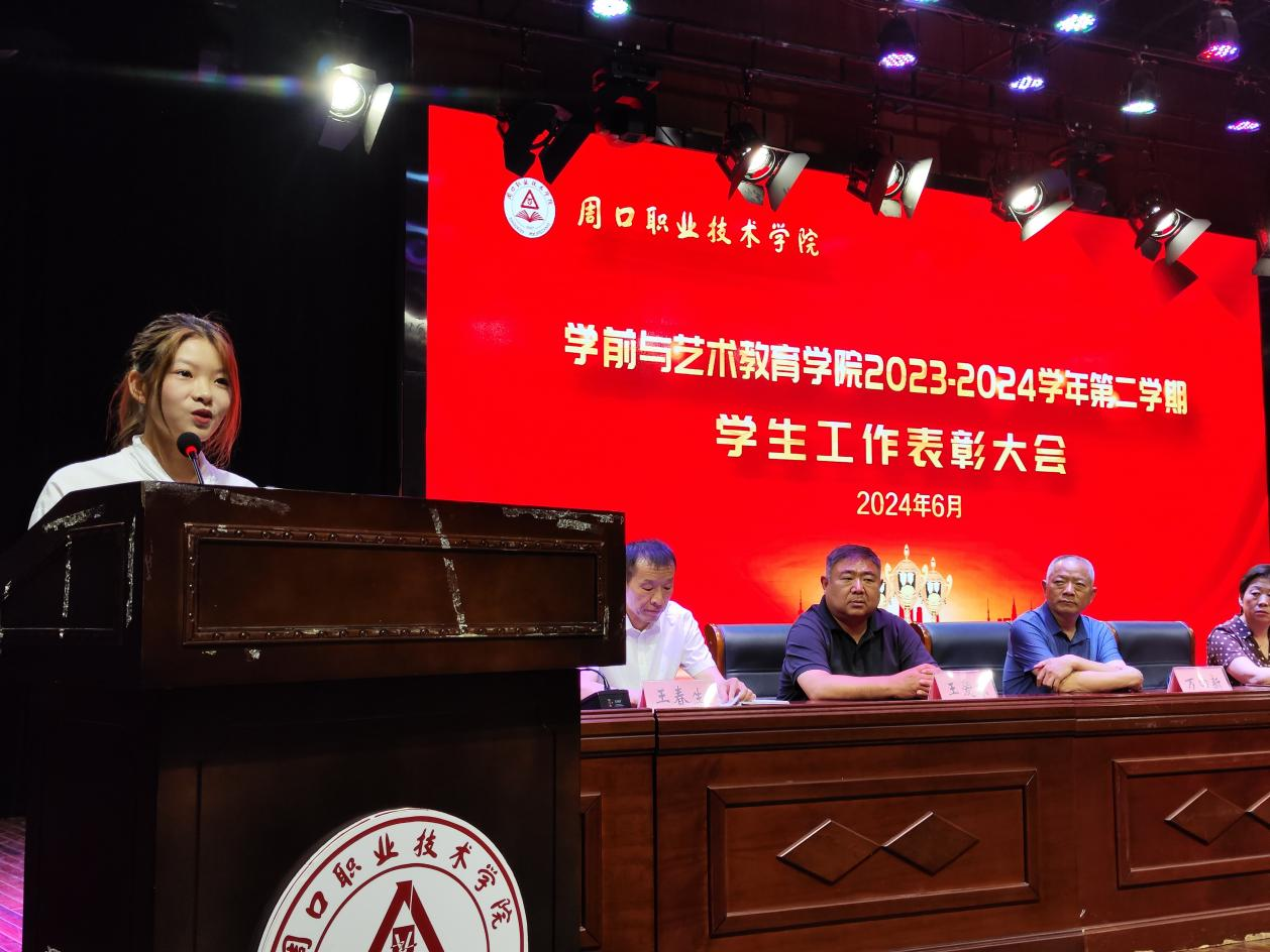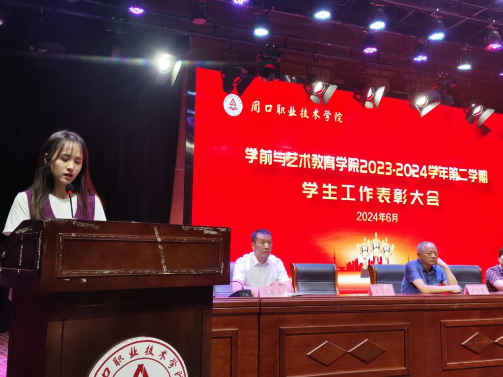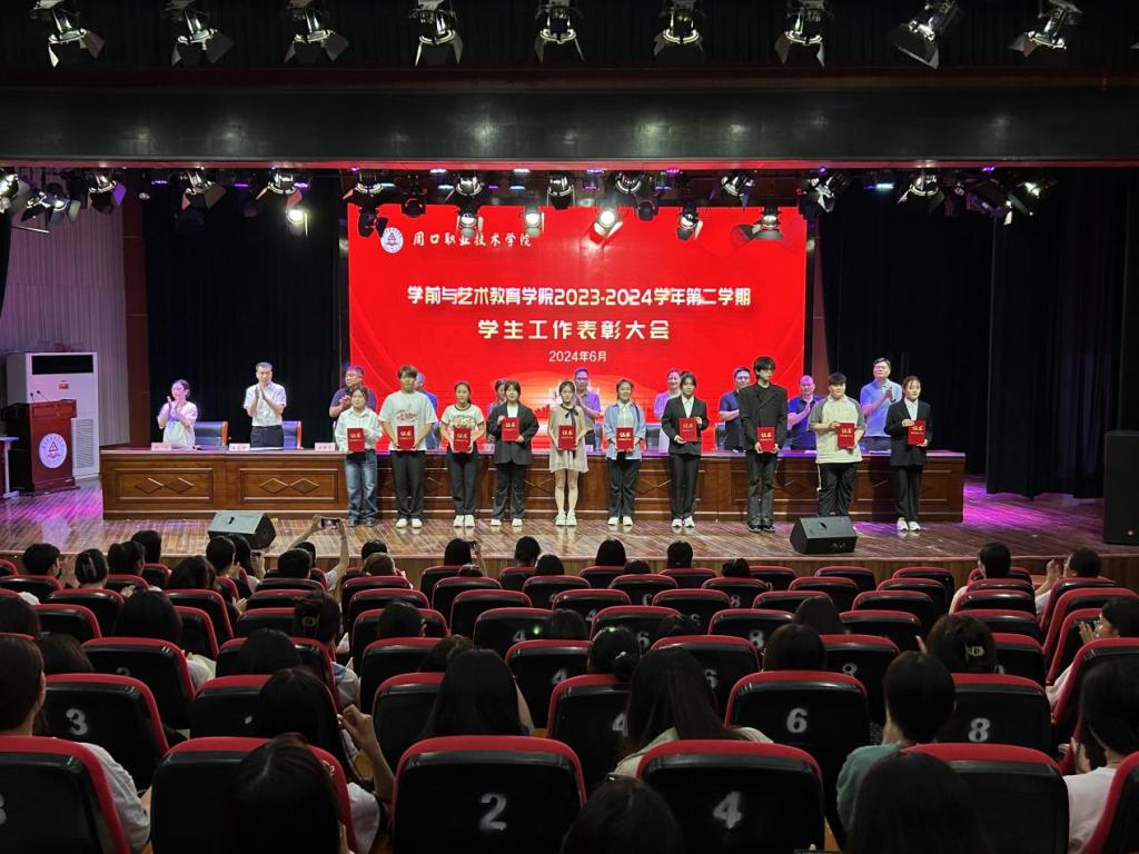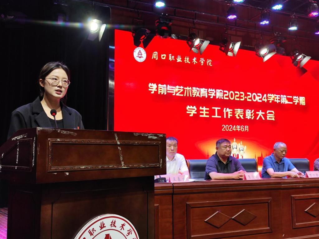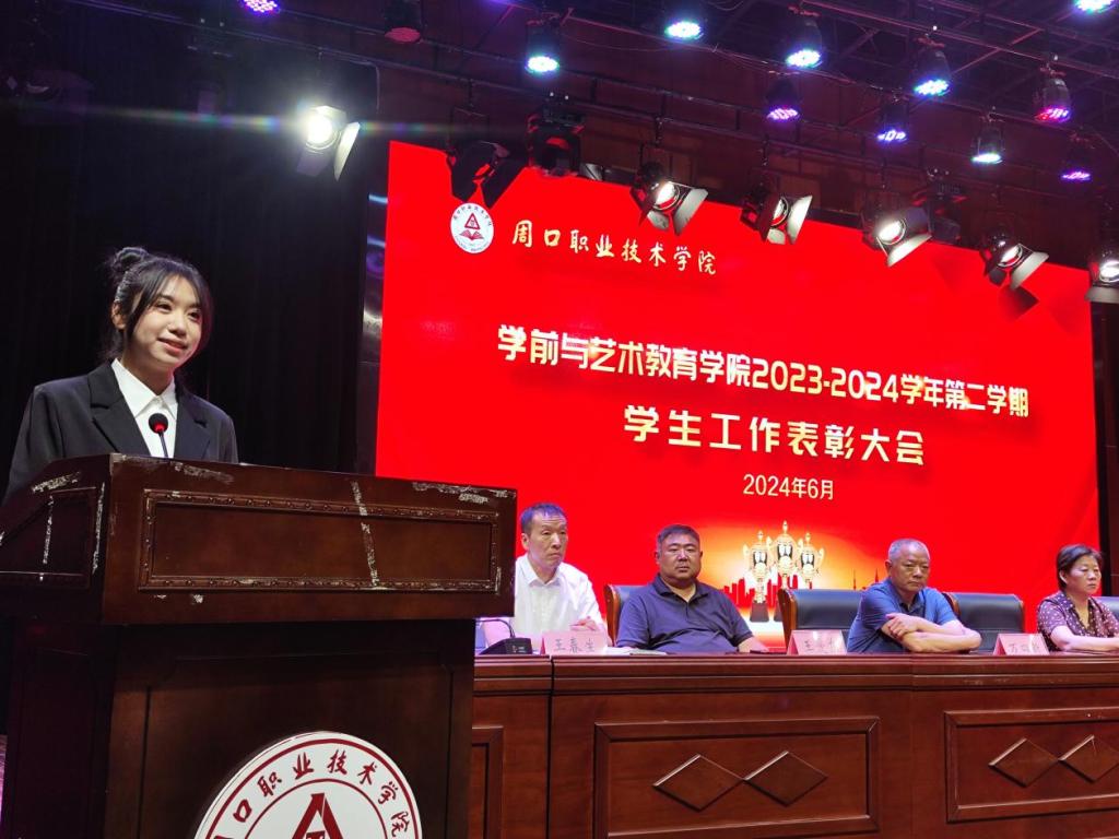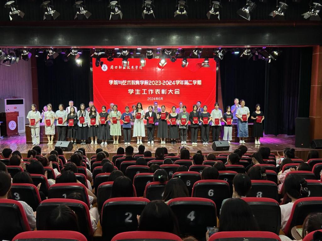 为表彰优秀,鼓舞斗志,凝聚优秀榜样力量,激励学生见贤思齐、奋发进取,营造校园浓厚学习氛围,6月12日晚,学前与艺术教育学院在校砺德厅举办2023—2024学年第二学期学生工作表彰大会。周口职业技术学院副校长李秀萍、副校长王隼、校党委宣传部部长万四新、学生处处长刘冬霞、后勤处处长王爱东、校团委书记闻檑出席,学院领导班子、教研室主任、辅导员、获奖学生及22、23级学生代表参加大会。大会由副院长杨晨主持。