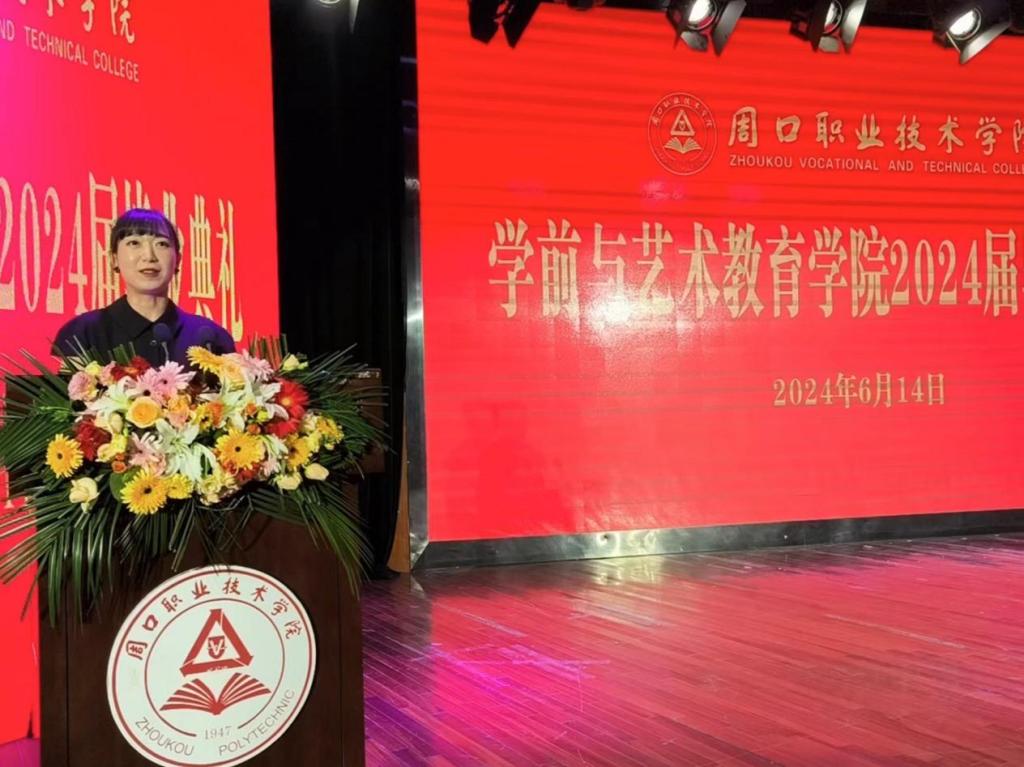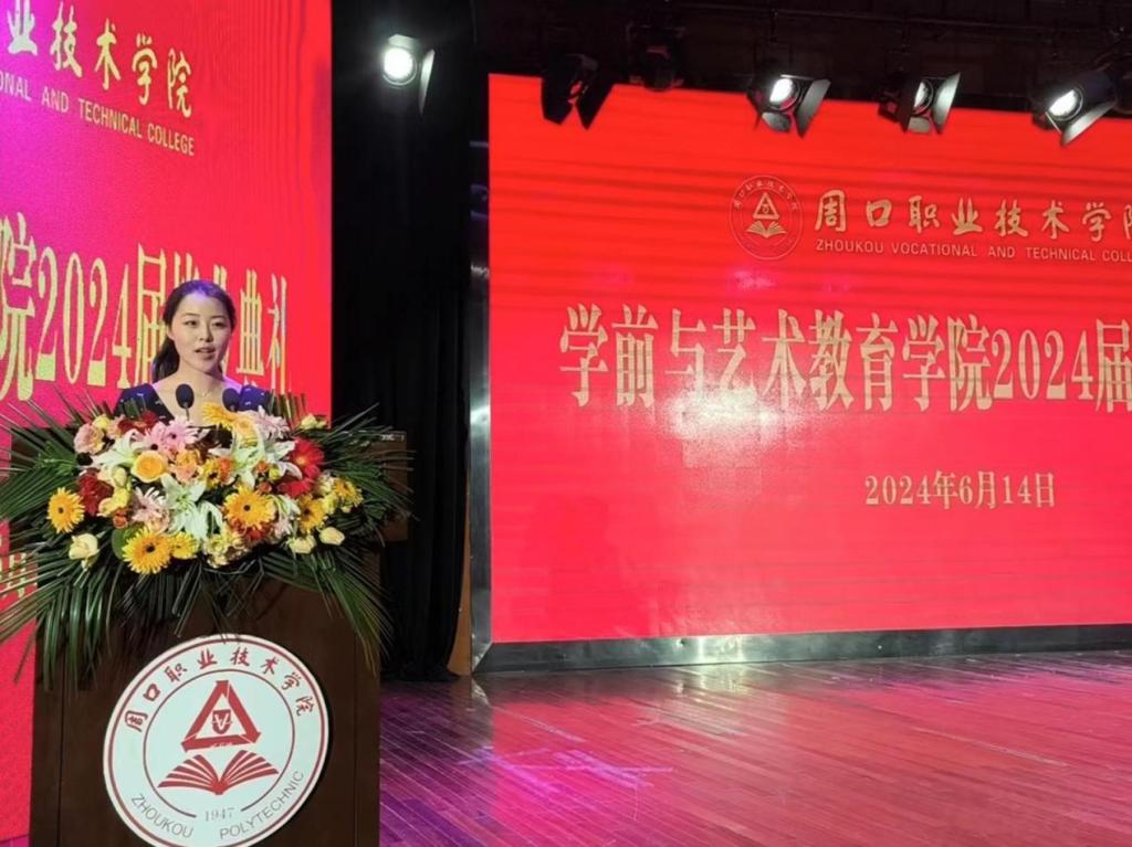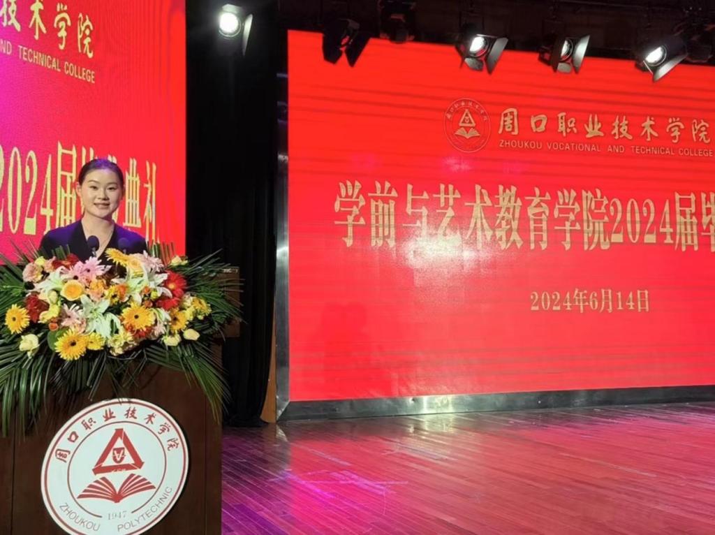 在校生代表2022级早期教育专业二班朱琳琳同学对那些即将踏上新旅程、揭开人生新章节的学长学姐们,致以最真挚的祝福。祝愿学长学姐们一帆风顺、前程似锦。同时,她表示将把他们作为楷模,勤奋学习,争取为学院的荣誉添砖加瓦。