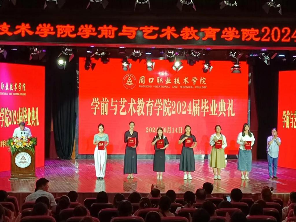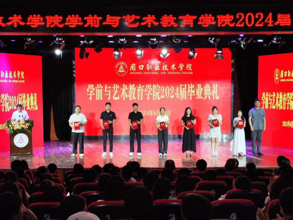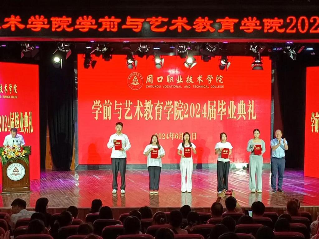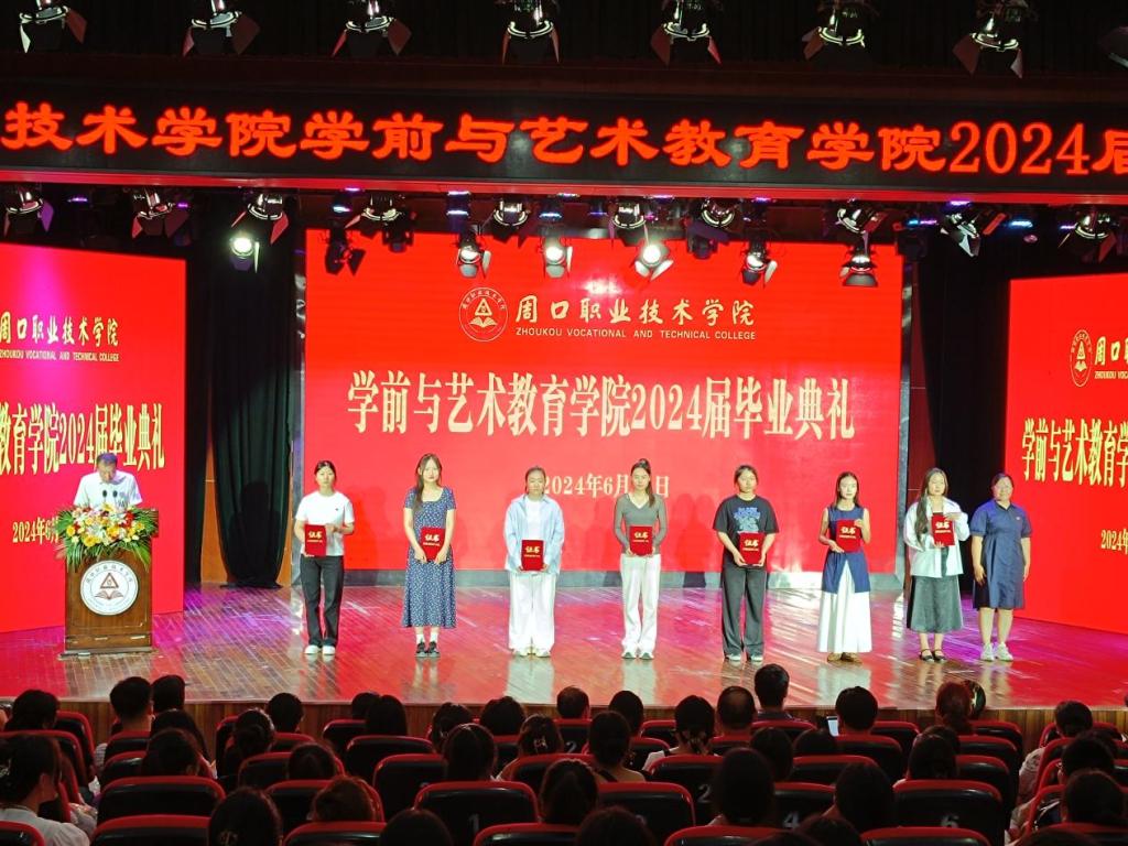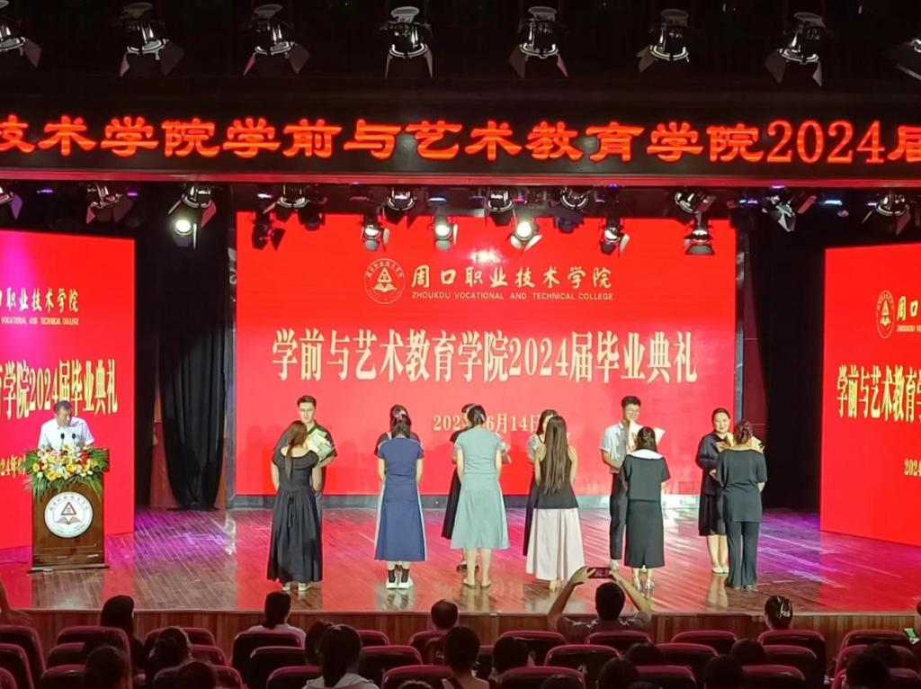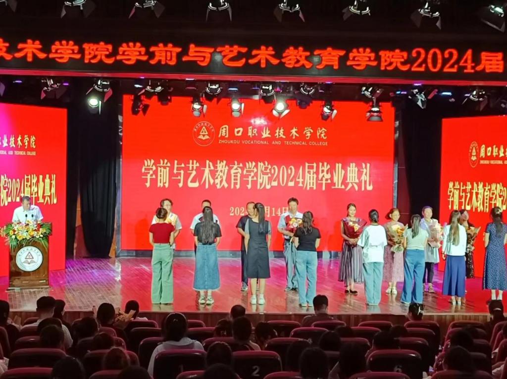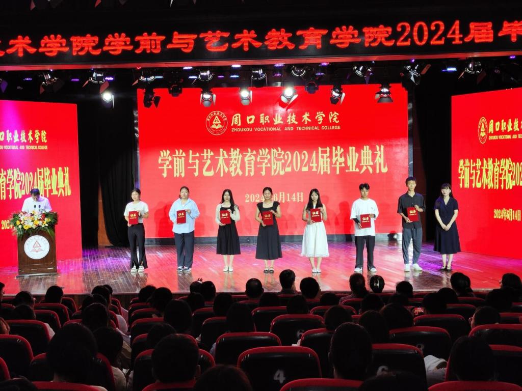 毕业典礼在庄严神圣的国歌声中正式拉开序幕。副院长杨晨宣读《周口职业技术学院关于表彰2024届优秀毕业生的决定》。学院领导分别为省级、校级优秀毕业生颁发荣誉证书。院长高岐奎为毕业生代表颁发毕业证书。随后,毕业生代表为辅导员与教师代表献花。