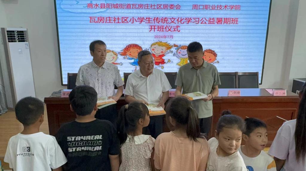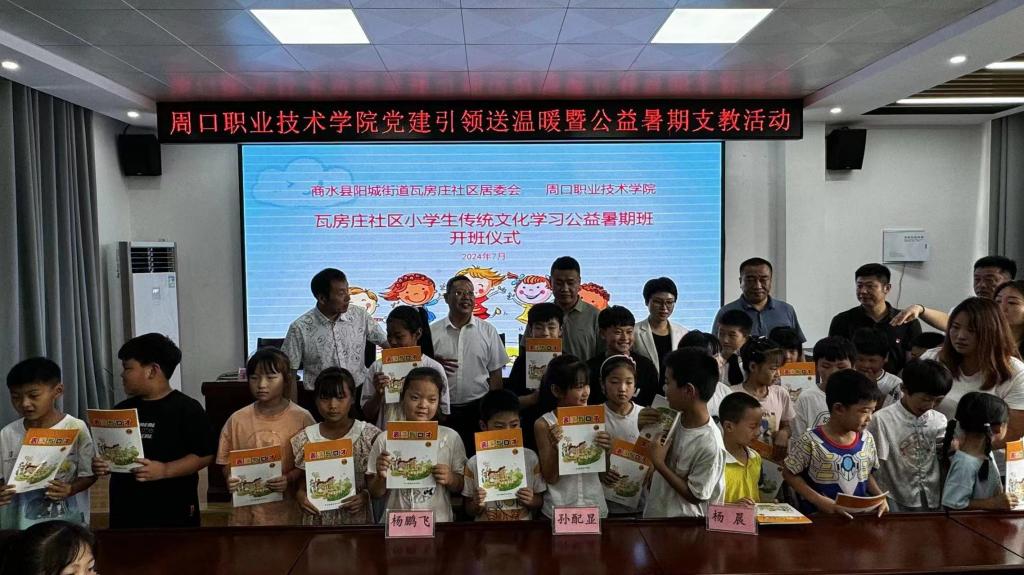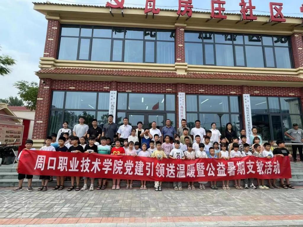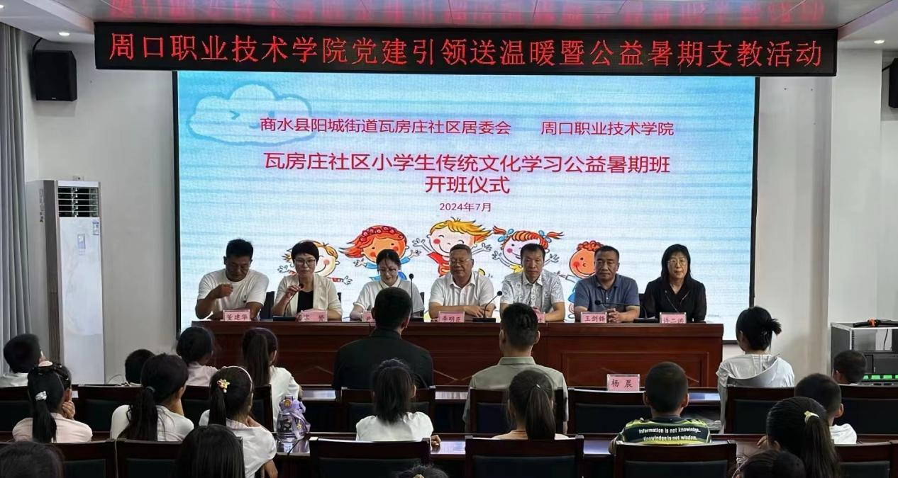 为深入学习贯彻习近平新时代中国特色社会主义思想,全面贯彻党的教育方针。7月1号,周口职业技术学院与商水县瓦房庄社区党建引领送温暖暨公益暑期支教活动开班仪式在商水县瓦房庄社区正式举行。河南省人民检察院驻瓦房庄第一书记宋赟、阳城街道办事处干部杨鹏飞、瓦房庄社区支部书记董建华、瓦房庄社区小学校长许二洪,周口职业技术学院党委副书记李明臣、团委副书记孙配显、学前与艺术教育学院校党总支书记王春生、副院长杨晨共同出席活动。暑期支教教师李帆、尹馨颐及40名儿童共同参加活动。本次活动由宋赟主持。