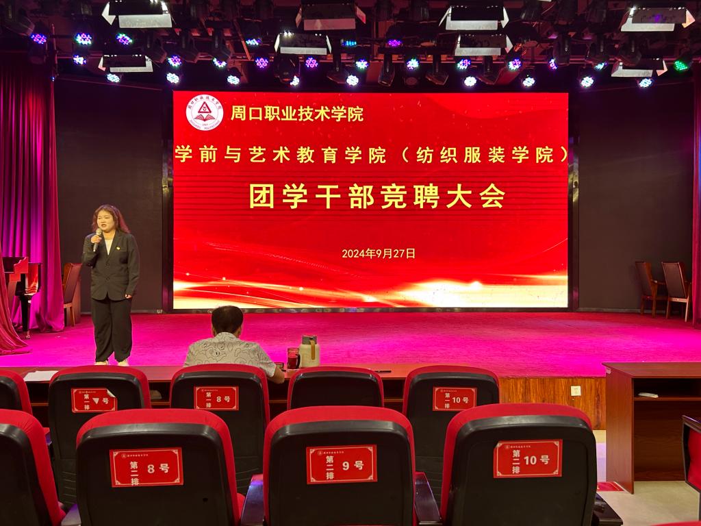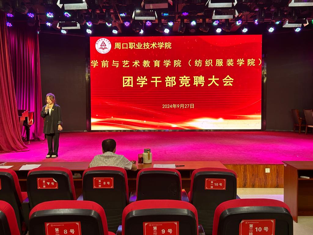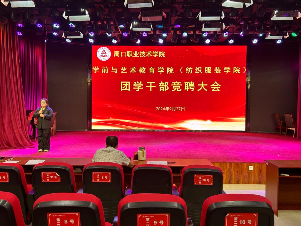 为促进学院团学干部工作发展,优化组织结构,挖掘潜力新生干部,9月27日下午,学前与艺术教育学院(纺织服装学院)在演播厅开展团学干部竞聘大会,学院党总支书记王春生、院长高岐奎、副院长杨晨、学管办主任郑玉凡、团总支书记刘馨馨、就业指导员董璧君、资助管理员石孟晓老师参加了评选工作。